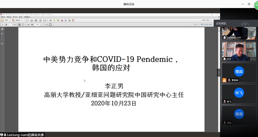 主办的名家讲座,在腾讯会议室举行。本次讲座邀请了高丽大学亚细亚问题研究院中国研究中心主任李正男教授担任主讲嘉宾,作题为“中美势力竞争和新冠肺炎疫情—韩国的应对”的学术讲座。成人导航