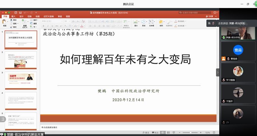 本次讲座邀请中国社科院政治学研究所当代中国政治研究室主任、研究员、博士生导师樊鹏教授担任主讲嘉宾,作题为“如何理解‘百年未有之大变局’”的学术讲座。成人导航
