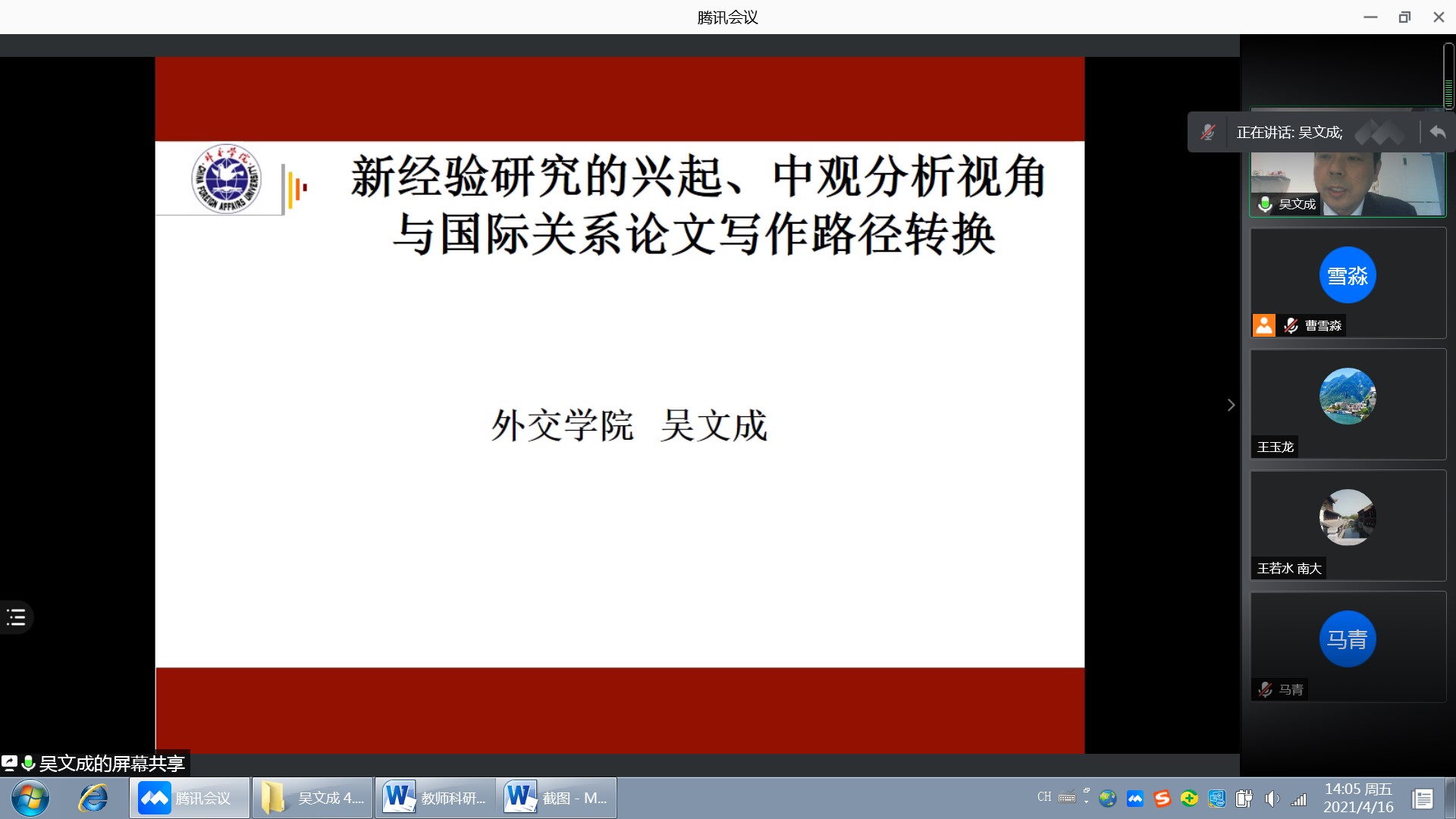 主办的教师科研水平提升计划第二十期活动在腾讯会议室举行。本次讲座邀请《外交评论》编辑部主任、清华大学《国际政治科学》编委、外交学院吴文成副教授担任主讲嘉宾,作题为“新经验研究的兴起、中观分析视角与国际关系论文写作路径转换”的学术讲座。成人导航