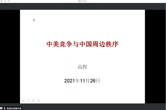 20211126日,成人导航 主办的成人导航 庆祝建校75周年系列学术活动暨教师科研水平提升计划第30期学术讲座在腾讯会议室举行。《当代亚太》执行主编、中国社会科学院拉丁美洲研究所副所长高程教授受邀担任主讲嘉宾,作题为中美竞争与中国周边秩序的学术讲座。成人导航 宫笠俐教授担任讲座主持人,成人导航 部分教师、研究生、本科生及国内其他高校师生共六十余人参加本期讲座。