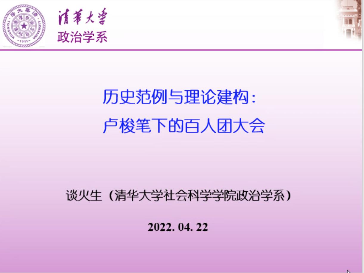 2022422日晚间,成人导航 第59期中国政治研究工作坊在腾讯会议平台举行。清华大学政治学系副主任谈火生长聘副教授受邀担任主讲嘉宾,作题为“历史范例与理论建构——卢梭笔下的百人团大会”的讲演。本期工作坊由刘雪华副院长主持,云南大学政府管理学院匡自明教授、东北师范大学政法学院肖克教授、华中师范大学农村研究院任路副教授、成人导航 马雪松教授、龚蔚红副教授、杨健潇副教授、朱万润副教授及部分国内高校政治学专业研究生、本科生60余人参与工作坊。