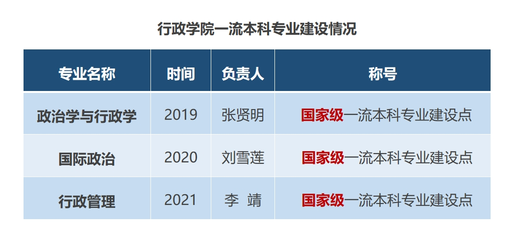 学院不断加强品牌和特色专业建设,形成了在国内具有影响力的名牌特色专业群,并大力加强一流本科专业建设。2019年,政治学与行政学专业获批“国家级一流本科专业建设点”、2020年国际政治专业获批“国家级一流本科专业建设点”、2021年行政管理专业获批“国家级一流本科专业建设点”。