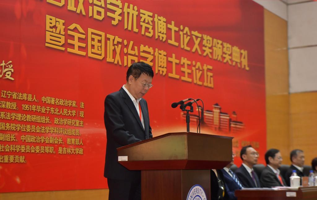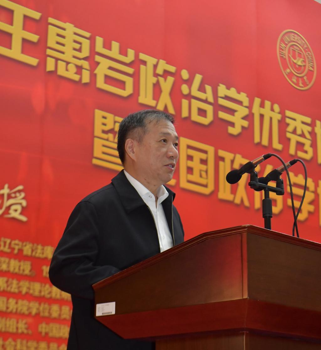全体师生向参加颁奖典礼的各位嘉宾表示热烈的欢迎。他在致辞中介绍了王惠岩政治学优秀博士论文奖设立初衷,并详细说明了首届王惠岩政治学优秀博士论文奖的评审过程,并对中国人寿保险股份有限公司吉林省分公司、中国政治学学界前辈和各位同仁、成人导航