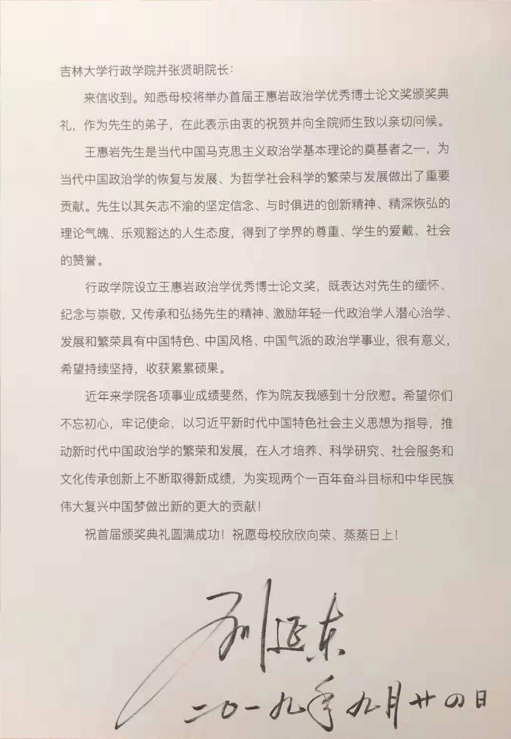 各项事业、特别是王惠岩政治学优秀博士论文奖以及全国政治学博士生论坛的大力支持表示衷心感谢。最后,张贤明院长宣读了学院杰出院友、王惠岩先生的弟子,原中共中央政治局委员、国务院副总理刘延东同志为此次颁奖典礼发来的信件,她由衷祝贺王惠岩政治学优秀博士论文奖颁奖典礼并向全院师生致以亲切问候。刘延东同志在信件中对王惠岩先生表达了缅怀,并勉励全院师生不忘初心,牢记使命,以习近平新时代中国特色社会主义思想为指导,为新时代中国政治学的繁荣和发展,在人才培养、科学研究、社会服务和文化传承创新上不断取得新成绩,为实现两个一百年奋斗目标和中华民族伟大复兴中国梦做出新的更大的贡献。