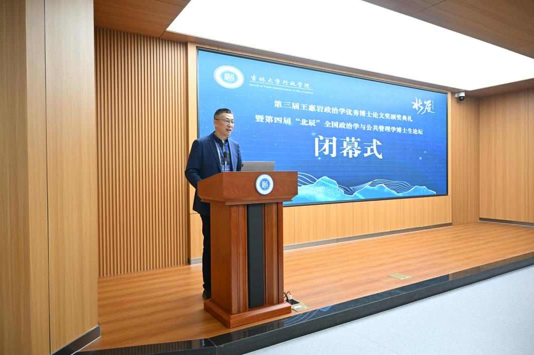 党委书记陈希贵致闭幕辞,陈希贵对获奖同学表示衷心的祝贺,对受邀参加本次论坛的专家学者、向来自各高校的青年学子致以诚挚的感谢,鼓励青年学子在时代浪潮中保持独立思考、敏锐观察,传承弘扬王惠岩先生守正创新、与时俱进的学术精神。最后,陈希贵对本次论坛的工作人员和志愿者表达感谢,并宣布第三届王惠岩政治学优秀博士论文颁奖典礼暨第四届“北辰”全国政治学与公共管理博士生论坛正式闭幕。