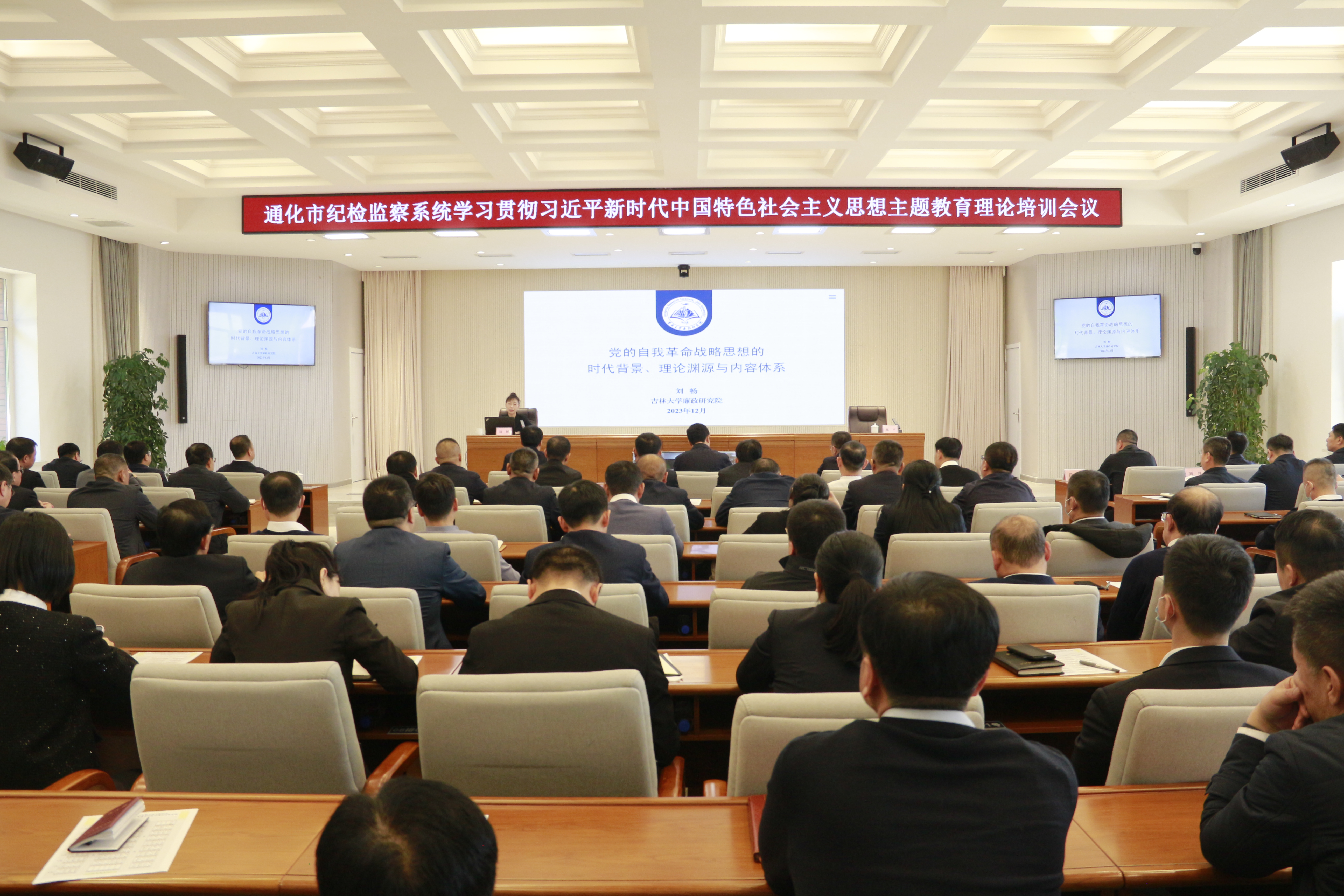 座谈会后,刘畅教授以《党的自我革命战略思想的时代背景、理论渊源与内容体系》为题,为通化市纪委监委主题教育理论培训会议做专题授课,主会场和7个分会场,共800多名纪检监察干部同步参会学习,通化市市委常委、市纪委书记、市监委主任邢平主持会议。随后,刘畅一行参观了通化市大数据智慧纪检监察中心。