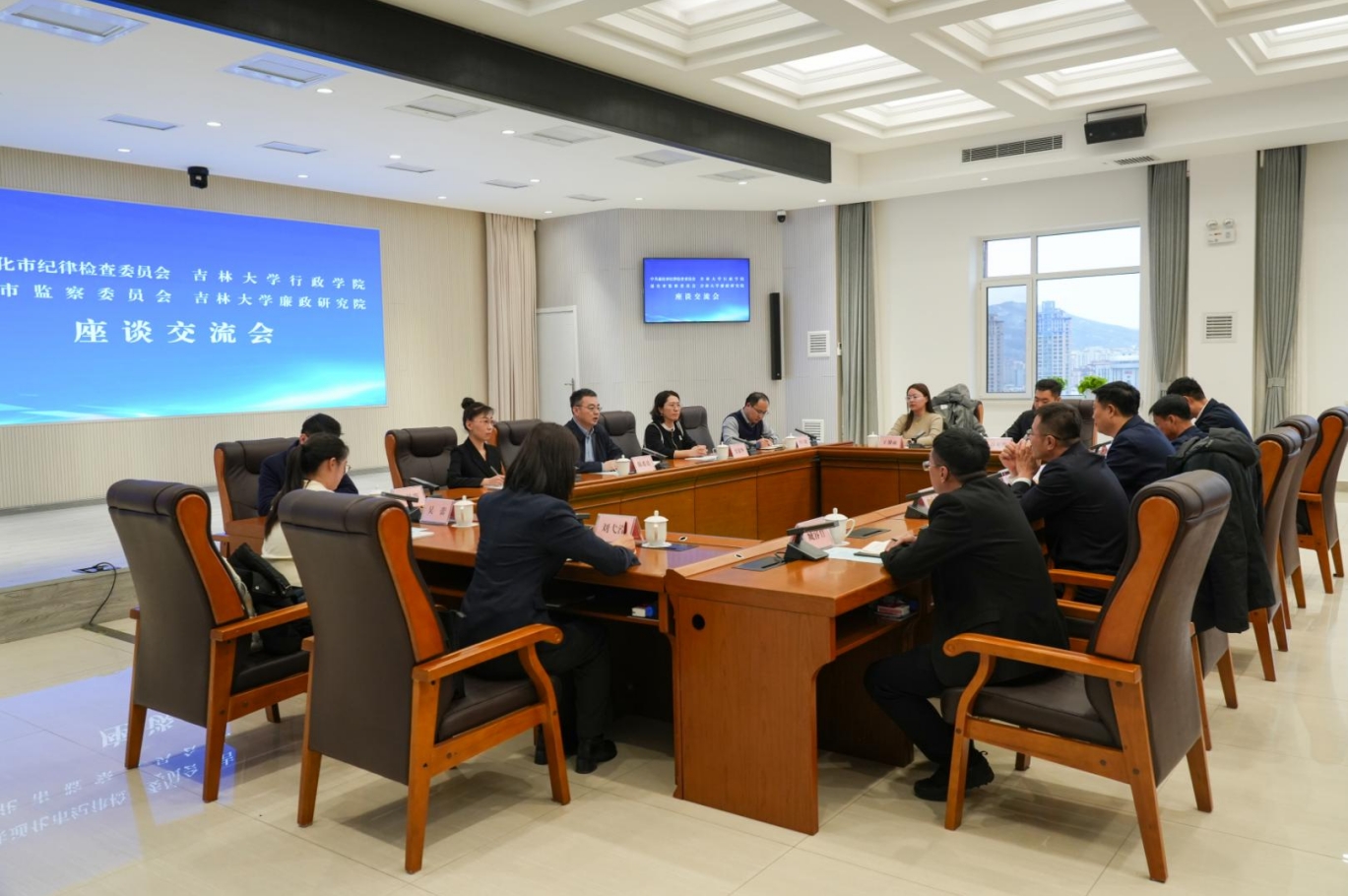 通化市市委常委、纪委书记、监委主任邢平,市纪委监委班子以及青年干部与参与调研的师生代表展开座谈,双方就学生实习实践、人才培养、理论研究合作等议题深入探讨。