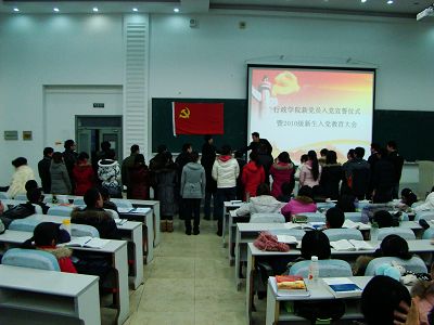 新党员入党宣誓仪式暨2010级新生入党教育大会在经信教学楼F5阶隆重举行。学院党委书记边铁、党委副书记许玉镇、佘彦、硕士生支部书记邵薪运、本科生支部书记马景惠出席会议,今年新加入党组织的研究生和本科生以及2010级全体学生参加大会。会议由党委副书记佘彦主持。