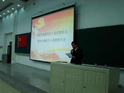 新党员入党宣誓仪式暨新生入党教育大会在雄壮的国际歌声中拉开帷幕,院党委副书记佘彦宣读了新党员名单,新党员面向党旗,高举右拳,在党委副书记许玉镇的领誓下进行了庄严的入党宣誓,铮铮的入党誓词使同学们深切地感受到了加入党组织的庄严与神圣。宣誓结束后,2008级学生梁述清代表新党员发言,他表达了新党员们对党组织的坚定信念,决心不断加强自身学习,提升思想文化素养,坚持党和人民的利益高于一切,认真履行党员义务。