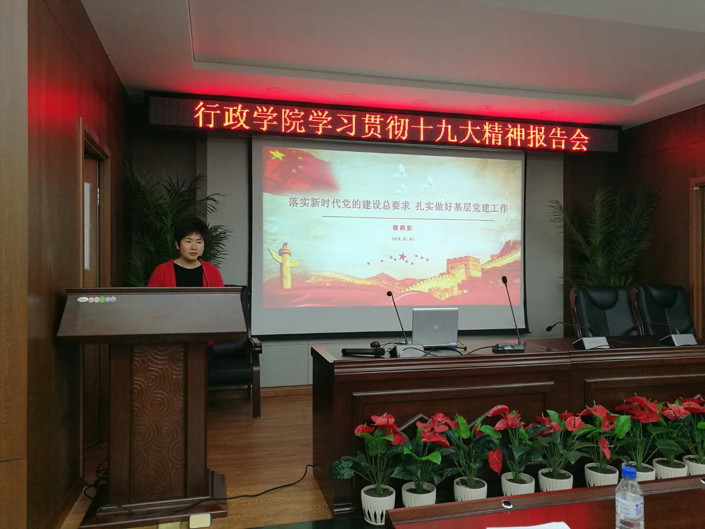 随后,党委书记魏鹤影以“落实新时代党的建设总要求,扎实做好基层党建工作”为题作主题发言。魏书记以“新时代”作为切入点,从根本原则、指导方针、脉络主线、实践路径等多个维度阐述了十九大报告中关于党建工作的总体要求和重点任务。她强调,作为基层党组织,要切实领会党中央的重大战略布局,宣传党的主张,贯彻党的决定,领导基层治理,团结动员群众,扎实做好本职工作,推动改革发展。党员干部要不断践行“信念坚定、为民服务、勤政务实、敢于担当、清正廉洁”的标准,教职员工要不断追求“有理想信念,有道德情操,有扎实学识,有仁爱之心”的目标。在2018年,希望全院上下一心,共同努力,为建设一流学科和一流学院起好步、开好头,为成人导航