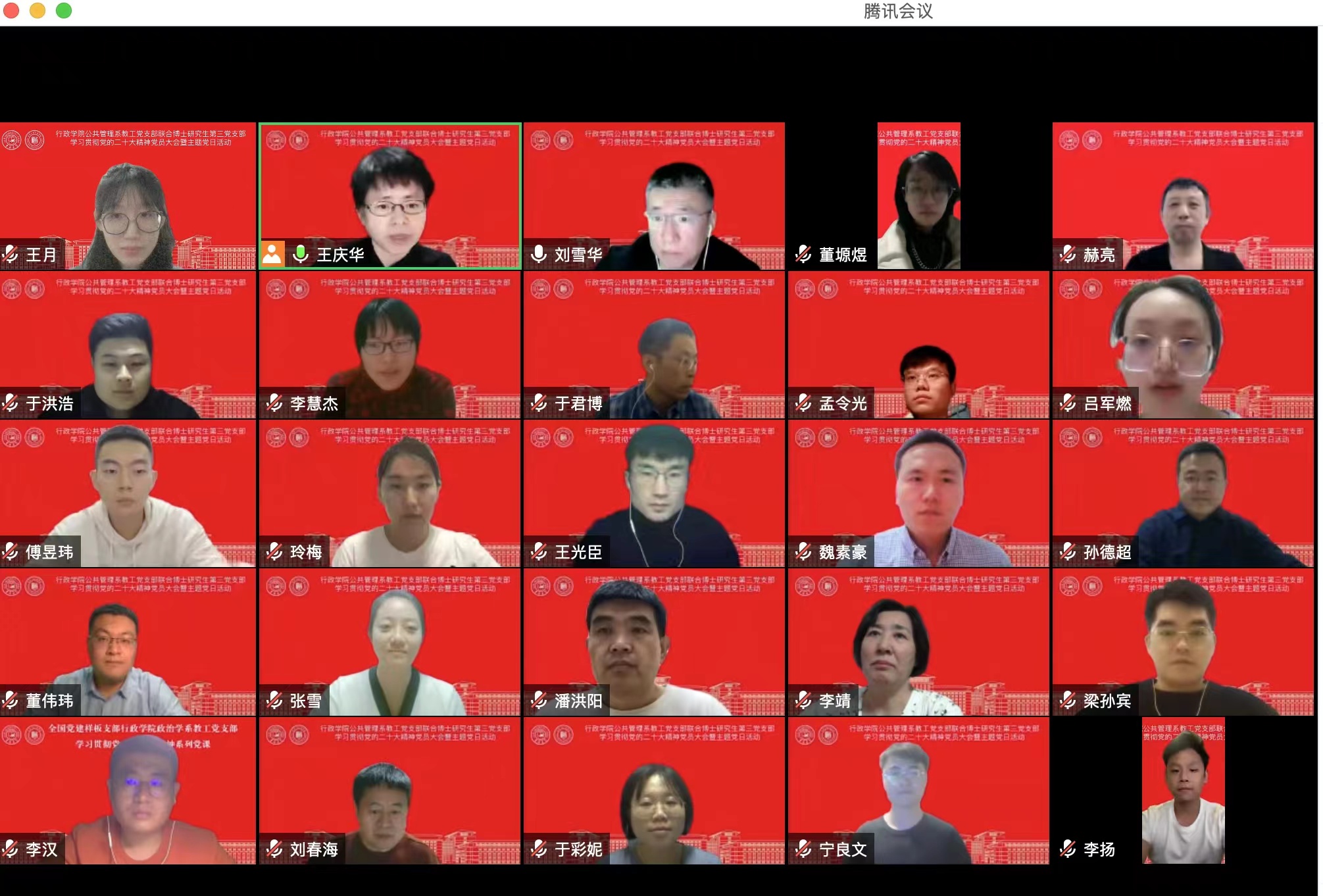 公共管理系教工党支部联合博士学生第三党支部开展“学习贯彻党的二十大精神”党员大会暨主题党日活动。公共管理系党员教师、非党员教师、博士研究生第三党支部全体党员和积极分子在内的40余人参加会议,会议由公共管理系教工党支部书记王庆华同志主持。