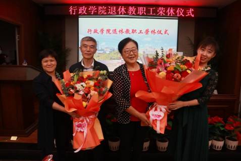随后,张贤明院长为王彩波教授、常有余同志颁发荣休证书、荣休纪念奖杯,年轻老师为两位老师献上鲜花。