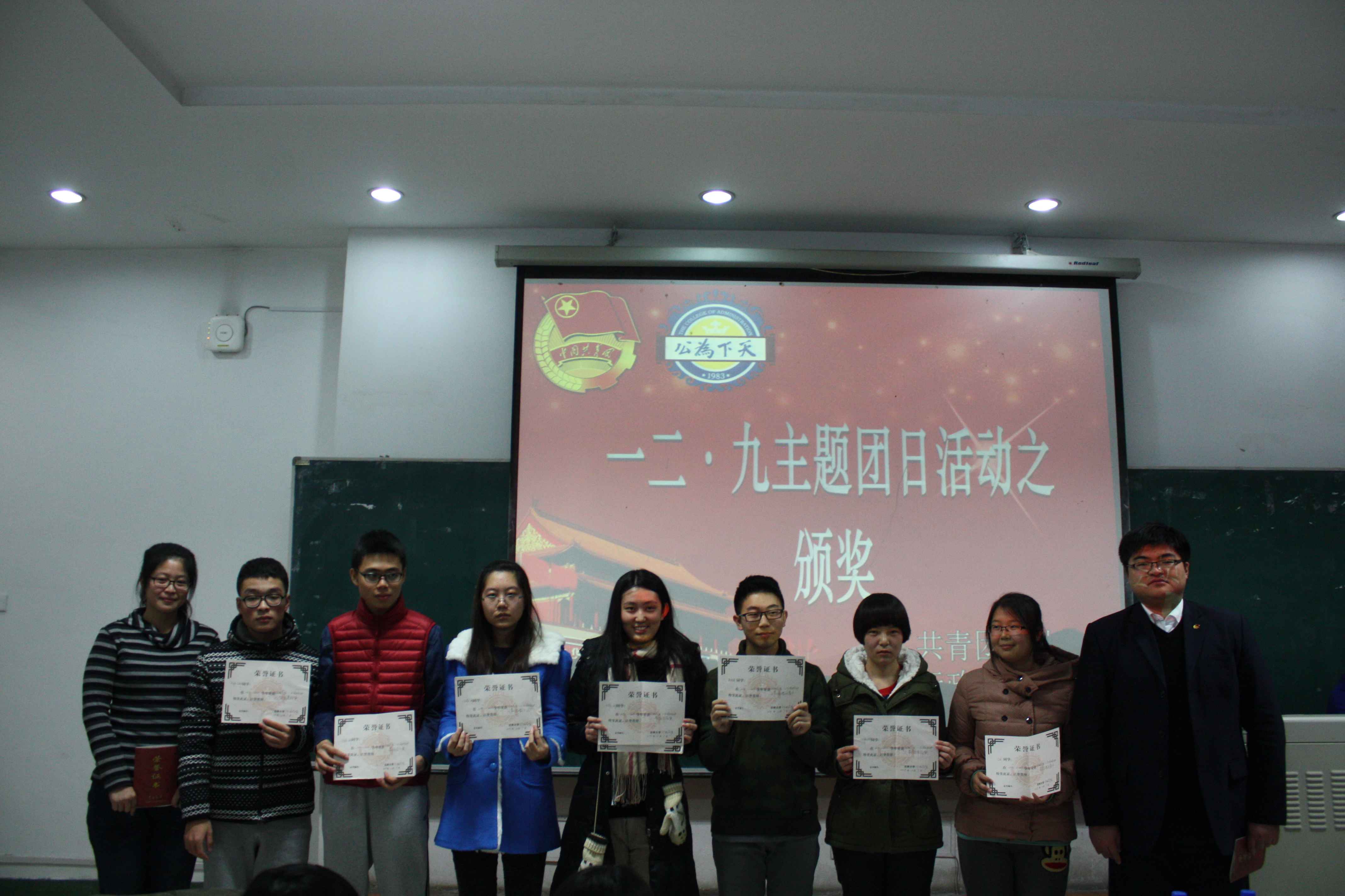 经过评定,最终社团代表队获得140分最高分,四班代表队以130分的成绩紧随其后,其他三支队伍并列120分。杨雨萌,白天获得最佳理论骨干奖;团总支代表队和四班代表队获得最佳理论团队奖。刘洋、曲畅竹为室内室外活动获奖的集体与个人颁奖并留影。