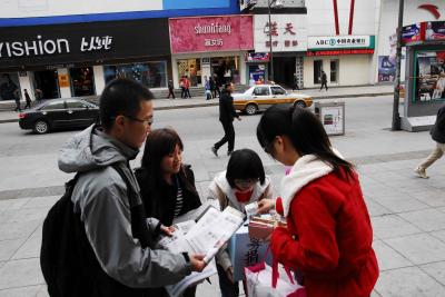 12日上午8时许,2014级的志愿者们到达了本次义卖活动的地点:重庆路。王晓燕社长将志愿者们分为7组,各组分散前往重庆路的各个商场、街道进行义卖。上午9时左右,气温骤降,寒风凛冽,志愿者们在恶劣的环境下仍坚持向过路行人介绍义卖活动的意义,呼吁大家献出一份爱心。路过的行人在听完志愿者的讲解后,都纷纷解囊,购买报纸。义卖活动于11:30圆满落下帷幕,500份报纸全部售出,共筹得善款1466.6元。筹得善款将全部捐予华宇老年公寓。
