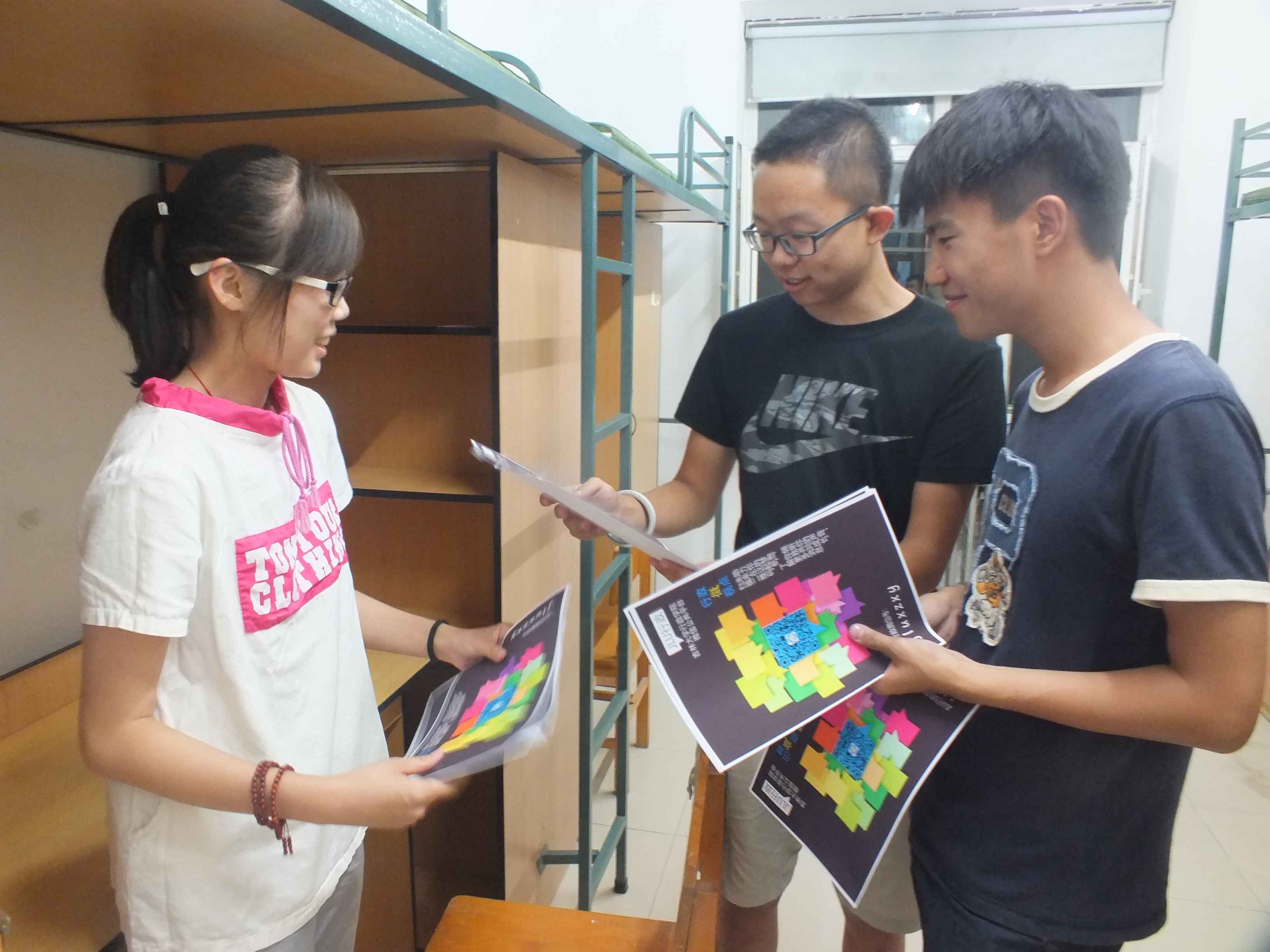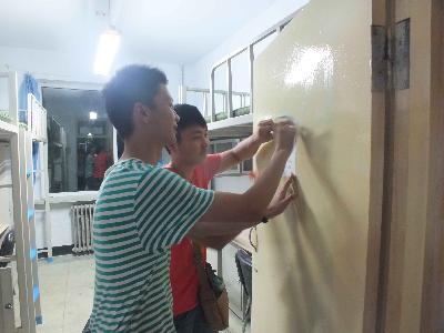 会议结束后,已是晚上7时许,大家一同前往2014级新生即将入住的寝室,进行迎新宣传单和新生寝室门楣、床铺信息单的张贴工作。