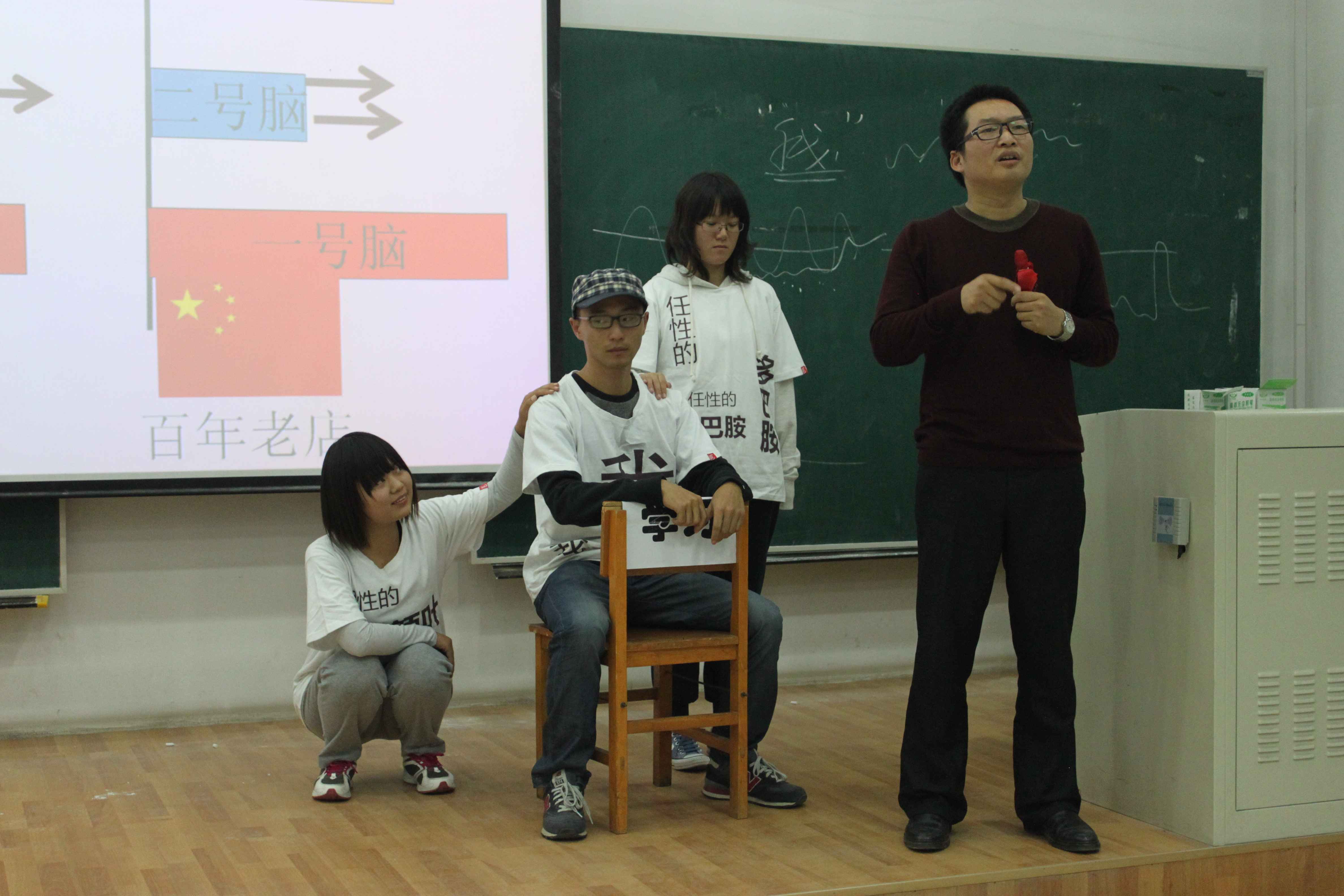 丁建略副教授从事心理学研究和咨询多年,擅长运用各种心理学技术解决问题,对青少年心理咨询和情爱咨询有多年的经验和成熟的理论积淀。丁建略副教授在讲座中用幽默生动的语言向与会人员讲述了关于脑科学的相关知识。他强调要从新的角度来看待心智问题,从脑科学的研究层次和脑整体理论研究这两个方向进一步说明研究脑科学的主要目的和脑科学研究对日常学习和生活的重要意义。为了更好地讲解网瘾在当代大学生群体中频发的问题,丁建略副教授与来自应用心理学专业的五位同学运用话剧向与会人员演示了多巴胺和前额叶对大脑产生的不同影响,生动形象地说明了脑科学在解决网络成瘾问题时起到的重要作用。丁建略副教授生动幽默、深入浅出的讲解让大家了解到了脑科学的专业知识,给在场同学留下了深刻的印象;讲座在热烈掌声中落下帷幕。
