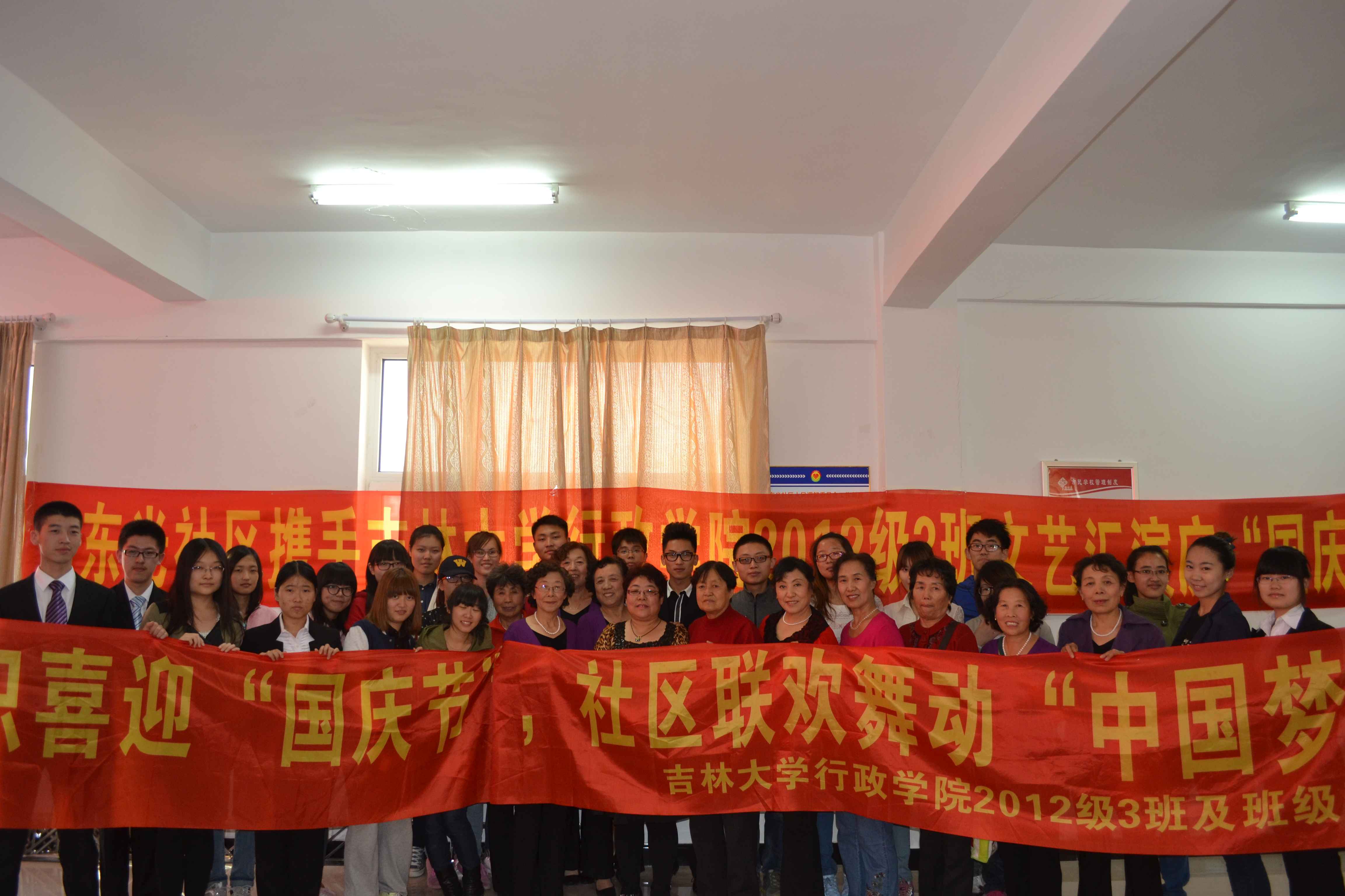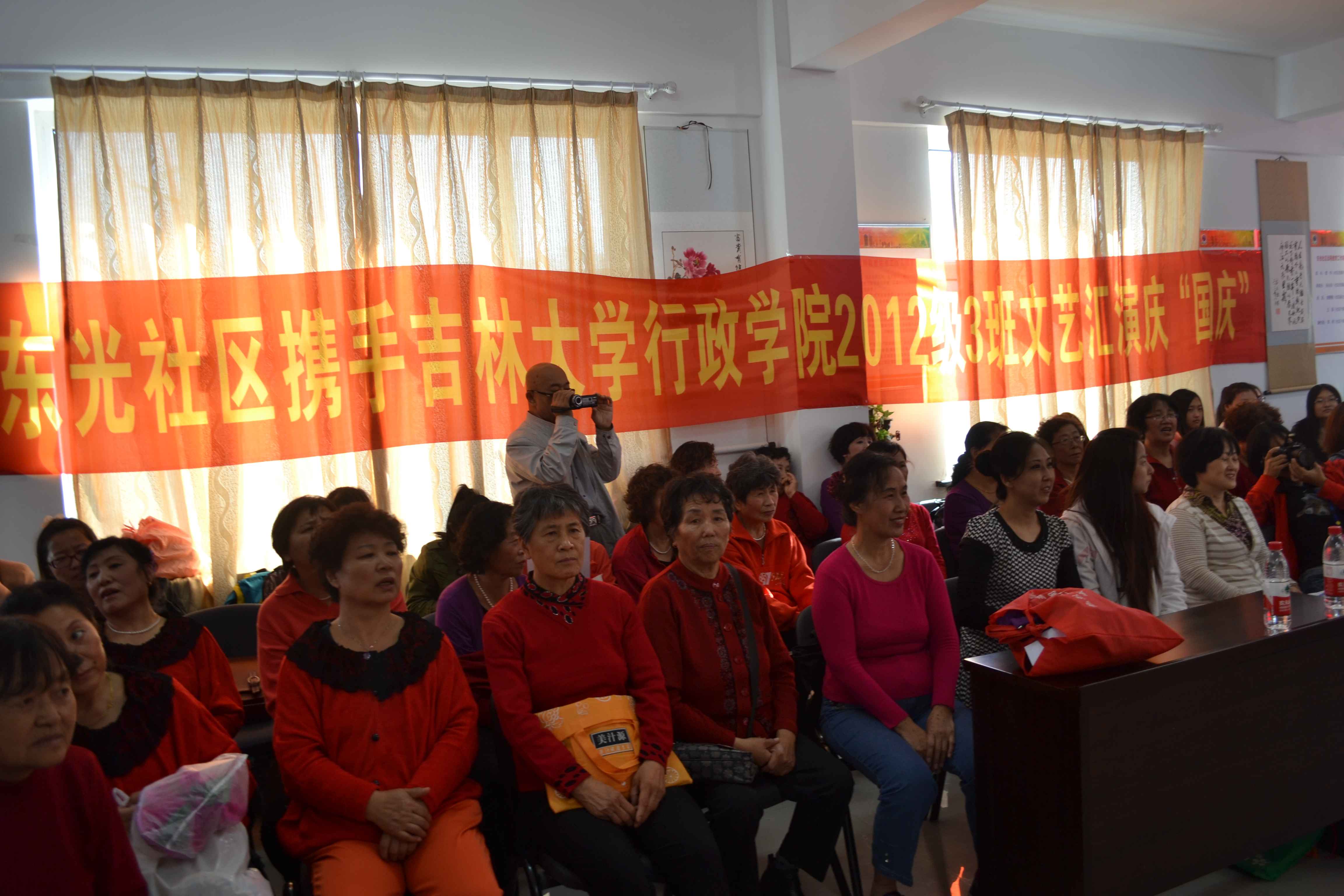 081203班于2013年9月27日与长春市前进街道东光社区携手举办“喜迎国庆节·联欢舞动中国梦”联欢活动。此次活动在东光社区社区服务大楼会议室举行。东光社区党总支书记曹伟,副书记王晶以及东光社区部分群众和成人导航