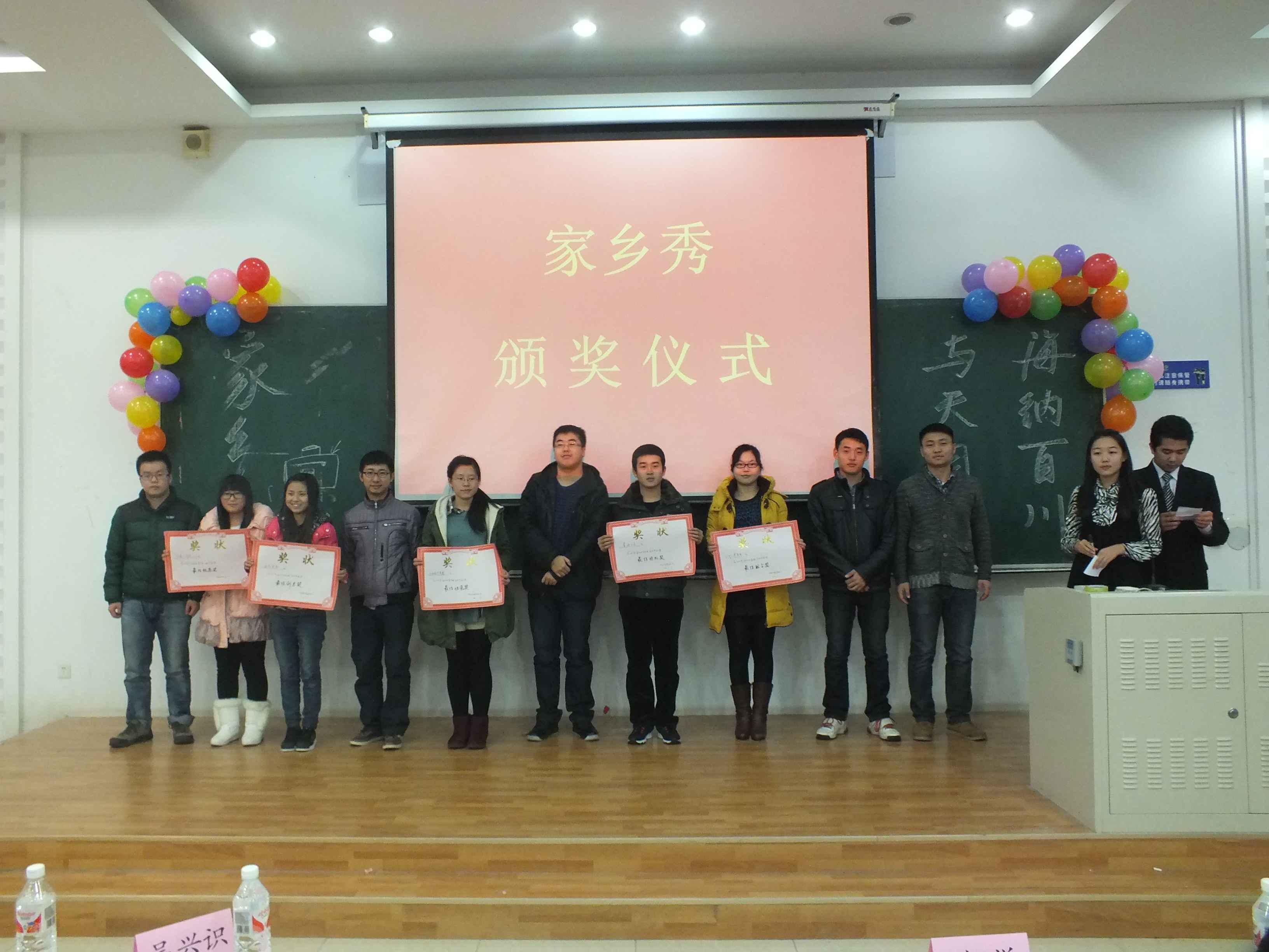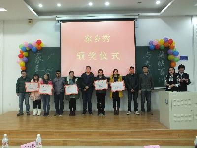 二十九个省份的同学分成“高端黑”、“大西南共荣圈”、“v587津冀鲁”、“西部牧歌”、“全明星”、“江南style”、“秦湖三宝”、“如你所见”等八支队伍参加此次比赛。大赛在荒岛诗社同学的一首《妈妈的船》诗歌朗诵中拉开序幕。在家乡风采展示环节,各个队伍依次登台,以各具特色的方式展示了各自家乡的风土人情、地方特色。美丽的山水、独特的风情和诱人的美食给现场观众们留下了深刻印象。才艺表演环节中,别出心裁的方言版诗朗诵《再别康桥》、幽默搞笑独具东北特色的小品《东北一家人》、特色鲜明的民族舞串烧等节目都赢得了观众的一致好评,活动现场掌声雷动,欢声笑语不断,同学们沉浸在欢乐的海洋中。而穿插在节目中间的游戏环节,更是极大地调动了观众的积极性,将现场气氛推向高潮。最后,经评委评议,“高端黑”队最终力压群雄,摘得桂冠,“如你所见”队和“全明星”队分获第二、三名。除此之外,另设“最佳创意”、“最佳团队”等奖项。吴兴识老师总结了此次活动,他希望同学们珍惜彼此的缘分,团结互助,共同走过一段充实、没有遗憾的大学生活。家乡秀在欢快热烈的气氛中结束。