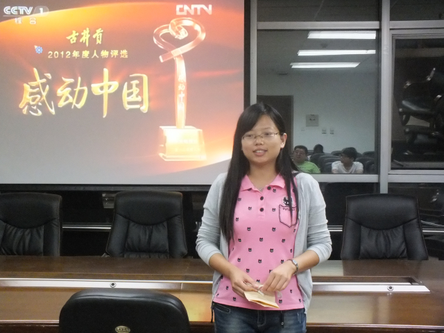 在本次活动中,大家一起观看了《感动中国2012年度十大人物颁奖典礼》,接受了一次震撼人心的美德教育。观看过程中,在场的同学无不为一位位感动中国人物的感人事迹而动容。尽职工作、直到生命最后一刻的林俊德院士,为了解群众困难“变身”民工的“卧底局长”陈家顺,为救学生奋不顾身的“最美女教师”张丽莉,南沙守礁97个月的老兵李文波和“爬”遍青山送医上门的艾起、周月华夫妇……一位位模范人物用他们的实际行动向世人展示出了人性的真善美,在场许多同学都流下了感动的热泪。