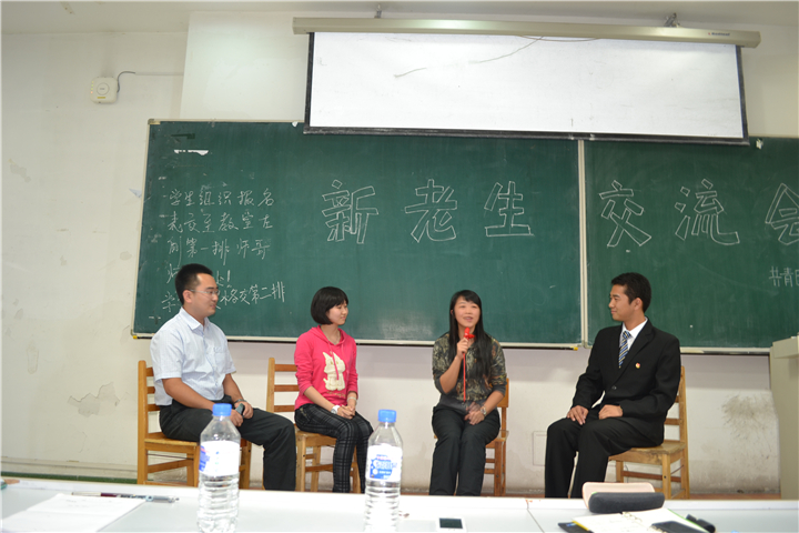 2013年新老生交流会。2010级优秀学生代表韦姮慧、张孟歌和张力伟应邀参加此次会议与2013级全体新生交流大学学习生活经验。本次活动由院团委秘书部副部长蔡敏(2012级)主持。