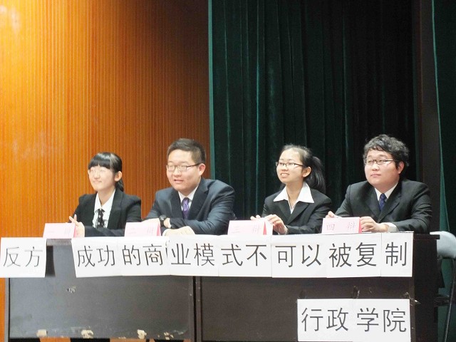 代表队,他们秉持的观点是“成功的商业模式不可以被复制”,正方数学学院代表队的观点是“成功的商业模式可以被复制”。