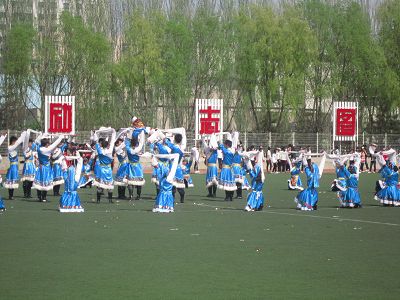 炎热的天气丝毫没有影响我院同学的发挥,和着《吉祥颂》悠扬的音乐,同学们翩翩起舞。精准到位的动作,灵动轻盈的步伐,复杂多变的队形吸引了人们的视线;随风飘舞的白袖蓝裙为炎热的夏日带来了一抹清凉。成人导航