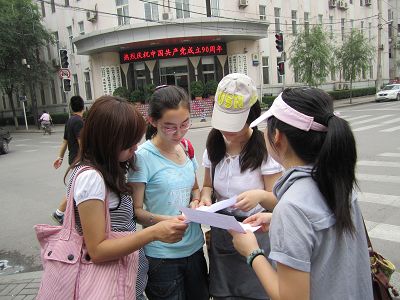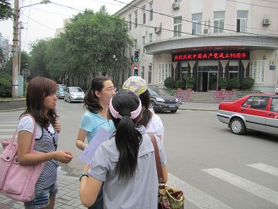 志愿者以“永远跟党走”为宣传口号,在沈阳地区开展了一系列暑期社会实践活动。为了更深入地将我们所要宣传的内容带到百姓身边,志愿服务小组采取了印发宣传单、口头讲授等形式。小组成员分工合作,将一百份印有简单党史、党的性质、党的先进性等内容的宣传单打印出来。为增加宣传单的可读性和亲民性,在宣传单的背面还印上一些先进共产党员的优秀事迹,如全国优秀共产党员郭明义等。随后,志愿者们分别在沈阳市的沈河区、大东区、和平区、铁西区及辽中县等区域进行发放宣传单,并对行人尤其针对青少年进行口头宣传,使之了解党的辉煌历史,同时旨在希望青少年积极向党靠拢,远离网吧、游戏厅,摆脱不良嗜好。