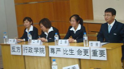 2008年10月18日晚,我院迎来了校“先锋论坛”辩论赛的首场比赛。我院对阵传统强队哲学社会学院辩论队,就尊严和生命的重要性问题展开讨论。我方作为反方,观点是“尊严比生命更重要”。首场比赛中我们获得了胜利,顺利晋级。