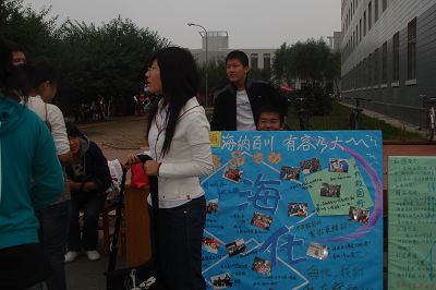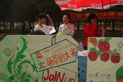 2008年9月20、21日两天,闻名遐迩的“百团大战”又拉开了她新一届的序幕。社团活动是大学生活中十分重要的一部分,也是拓宽人际交往的有效途径,因此每年的社团纳新都是一年新生工作中的重点。隶属我院的海化实践社、思潮社以及外语协会也早早地就做好了前期的准备及宣传工作,其中外语协会还顺利通过年审并荣获今年的校优秀社团的称号。本年度三个社团的纳新人数都创历史新高,外语协会106人、海化社74人、思潮社38人,不仅实现了人数上的突破,而且吸纳了很多来自不同院系和专业的同学,其中外语协会还吸纳了美籍学生作为名誉会员。