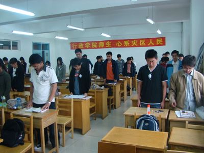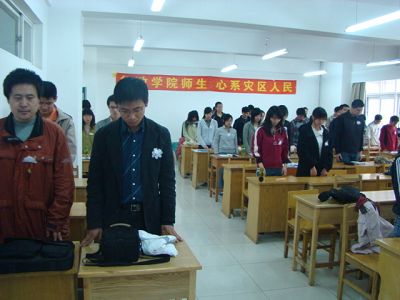 本科生在学办老师的组织下进行集体默哀,下午2点10分,马景惠老师到第三教学楼513教室,同05级本科学生进行了集体默哀仪式。28分时,警报拉响,教室内全体师生身带白花,起立默哀,沉痛悼念灾难中逝去的同胞兄弟们,整个教学楼陷入了庄严的沉寂中。
