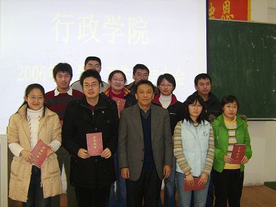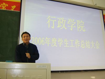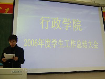 会议由马景惠老师主持,他首先对学院2006年的学生工作做了详细总结。之后,党支部、团委、学生会、“行政之光”等学生团体以及各年级学生代表也分别做了总结发言,向大家汇报一年来取得的成绩,反思不足之处,并提出了新一年工作的计划和设想。在各部门总结汇报之后,佘书记为这一年来在学生工作各方面取得优异成绩的组织和个人颁发了荣誉证书。会议最后,佘书记在听取大家总结的基础上与同学们进行了深入的交流,表达了自己的感动与感慨,并重点谈了学生干部需要具备的几项技能,使同学们受益匪浅。