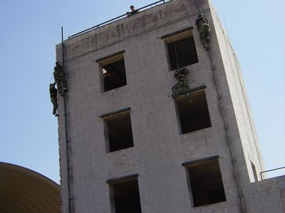 攀爬表演十分刺激惊险,在一处训练用的攀登楼旁,同学们仰视着楼墙上一个个身手矫健的特警,徒手攀爬游走于墙根楼顶,可以想象在执行救援等特殊任务时,这样灵活的身手是多么有力的保障啊!还有平行于地面的楼顶俯冲表演,赢得同学们阵阵掌声与欢呼。