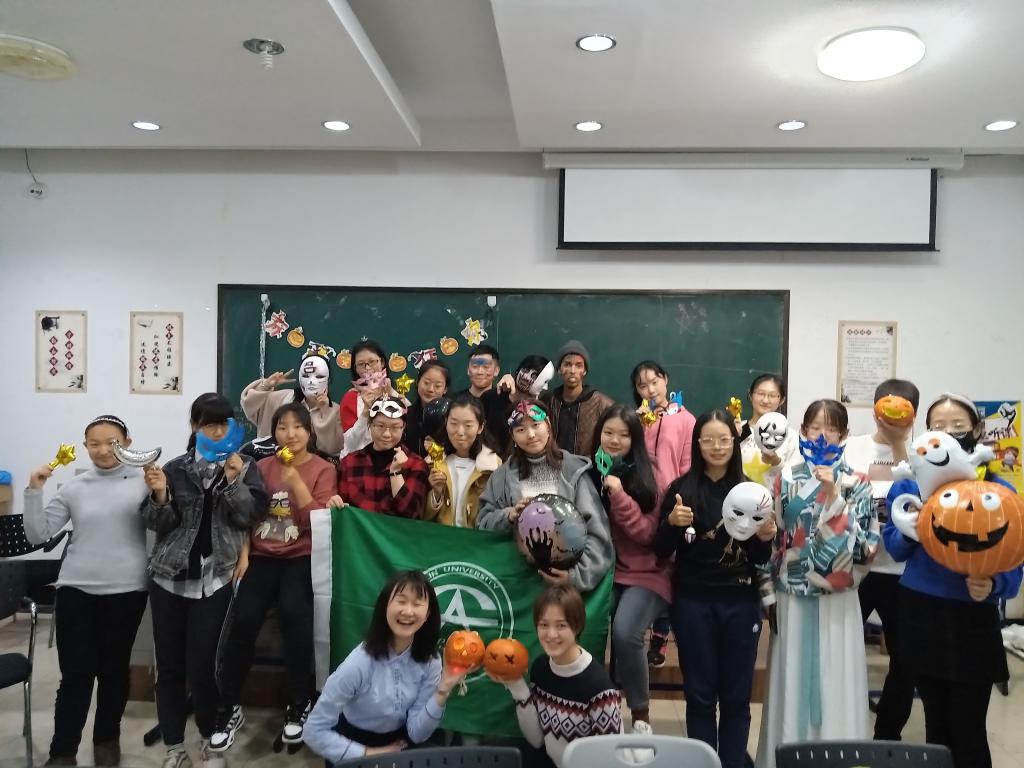 外语协会在经信教学楼C101室举办了以万圣节为主题的英语角活动。共有20余名同学参加了本次活动,其中包括数名留学生。