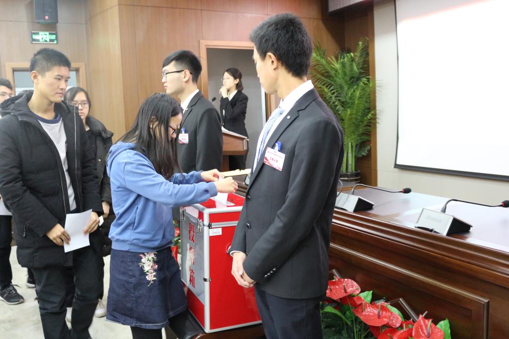 团委组织部负责同学张雪妍宣读了大会监票员、计票员名单,该名单由学生代表举手表决并通过(本次大会应到64人,实到55人,符合规定人数,表决有效)。成人导航