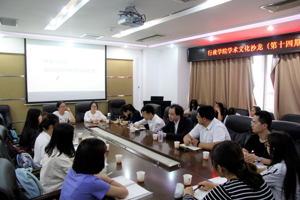6月13日晚,《行政之光》杂志社于东荣大厦1214室举办了第十四期学术文化沙龙。本期沙龙以“两难与抉择——脱欧进程中的英国与欧盟”为主题,邀请到了我院国际政治系许宁老师作为点评嘉宾。院学生工作办公室主任、辅导员刘洋及20余名本科生同学参加了本期沙龙。本期沙龙张砚清(2017级本科生)同学主持。