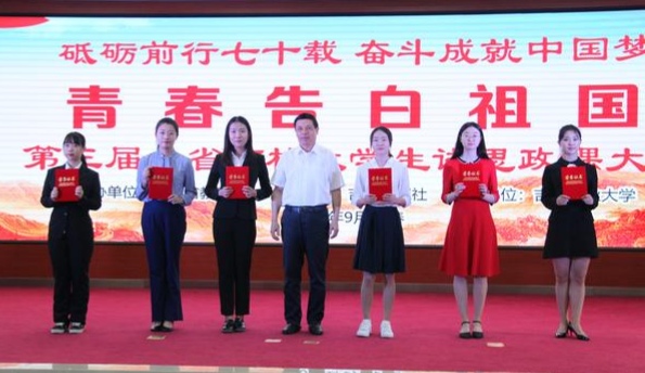 省赛决战,力压群雄、尽展风采。9月2日,省赛说课比赛。团队师生从教学目标、重点难点、教学方法、课程导入等多个方面对课程设计进行了全面说明。深厚的积淀、生动的语言、细致的讲解赢得了观众们热烈的掌声。我院代表队以总分第一名的成绩领先全场。9月3日,省赛讲课比赛。十五分钟,四千多字,全程脱稿,背稿时间不过五天。主讲郭光婷同学四点起床背稿,晚上十二点还在反复熟悉PPT。在高烧三十九度的情况下,她仅仅休息了半天,便又主动投入比赛的准备之中。台上十五分钟,台下一百余次练习。充分的准备、顽强的毅力使她在生病的情况下依然表现出色,她精彩的授课得到了评委的赞赏与肯定,并在讲课结束后接受了中国教育报记者的采访。最终我院代表队、马克思主义学院代表队以并列第一名的优异成绩斩获第三届吉林省高校大学生讲思政课大赛一等奖。