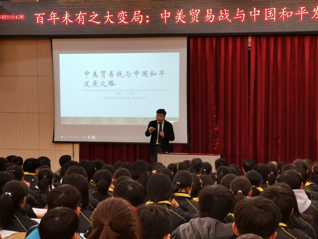 21日下午,我院一行来到湖北省重点中学东风高级中学。首先,于海洋教授在报告厅为100余名高三文科生做了题为“百年未有之大变局:中美贸易战与中国和平发展之路”的专场学术报告。随后,进行了“成人导航