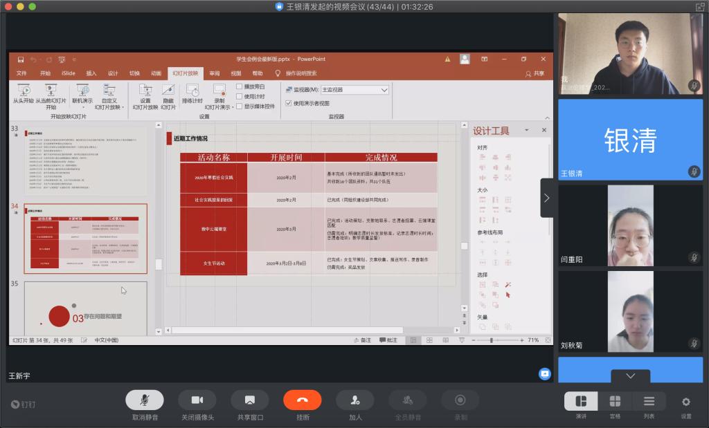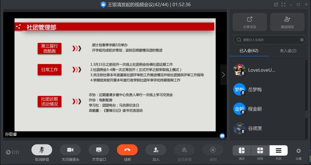 新学期伊始,院团委工作已逐步在线上推进。会上,团委及学生会主要负责人就近期工作开展情况及新学期工作安排进行汇报。他们指出了近期工作开展中存在的问题并进行相关培训。随后,在线上交流环节,大家就工作开展中遇到的各种问题,展开讨论,共同协商解决方案。同时,也达成要在今后的学生工作中实时反馈、高效解决问题的共识。