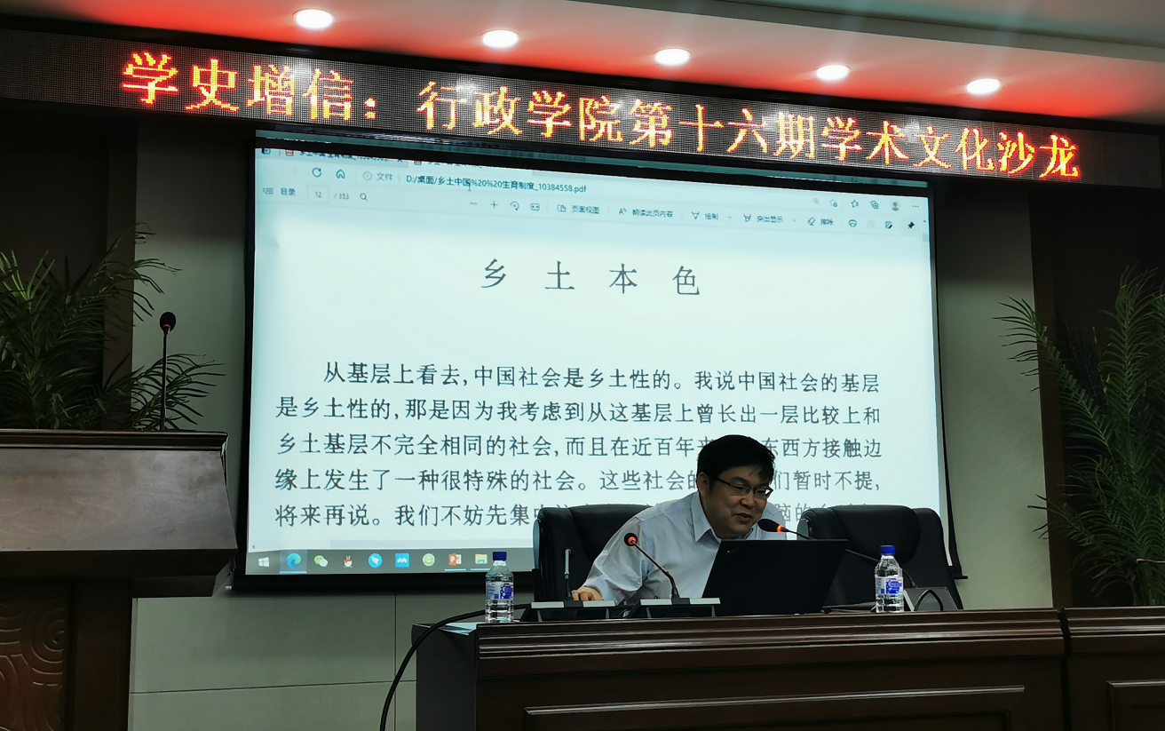 5月25日晚,《行政之光》杂志社于中心校区举办了“学史增信”主题第十六期学术文化沙龙。本期学术文化沙龙邀请到了我院政治学系丁建彪副教授作为主讲嘉宾,为大家带来了题为“费孝通《乡土中国》中的中西思想与文法之风”的分享。本期学术文化沙龙由畅达禹同学(2019级本科生)主持。
