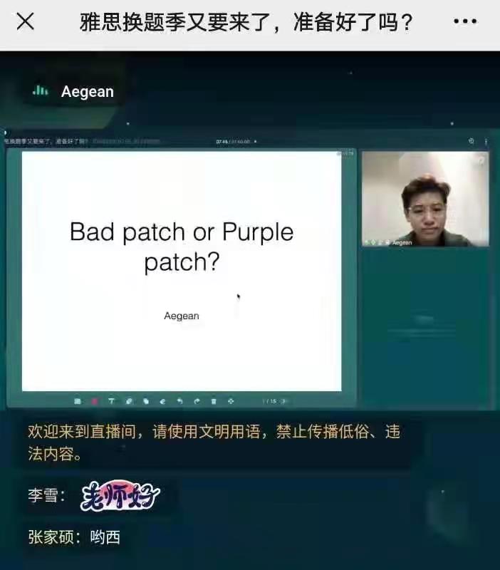 外语协会特邀请资深口语教师Aegean于8月21日上午在线上举办了“雅思口语换题季”专题讲座。
