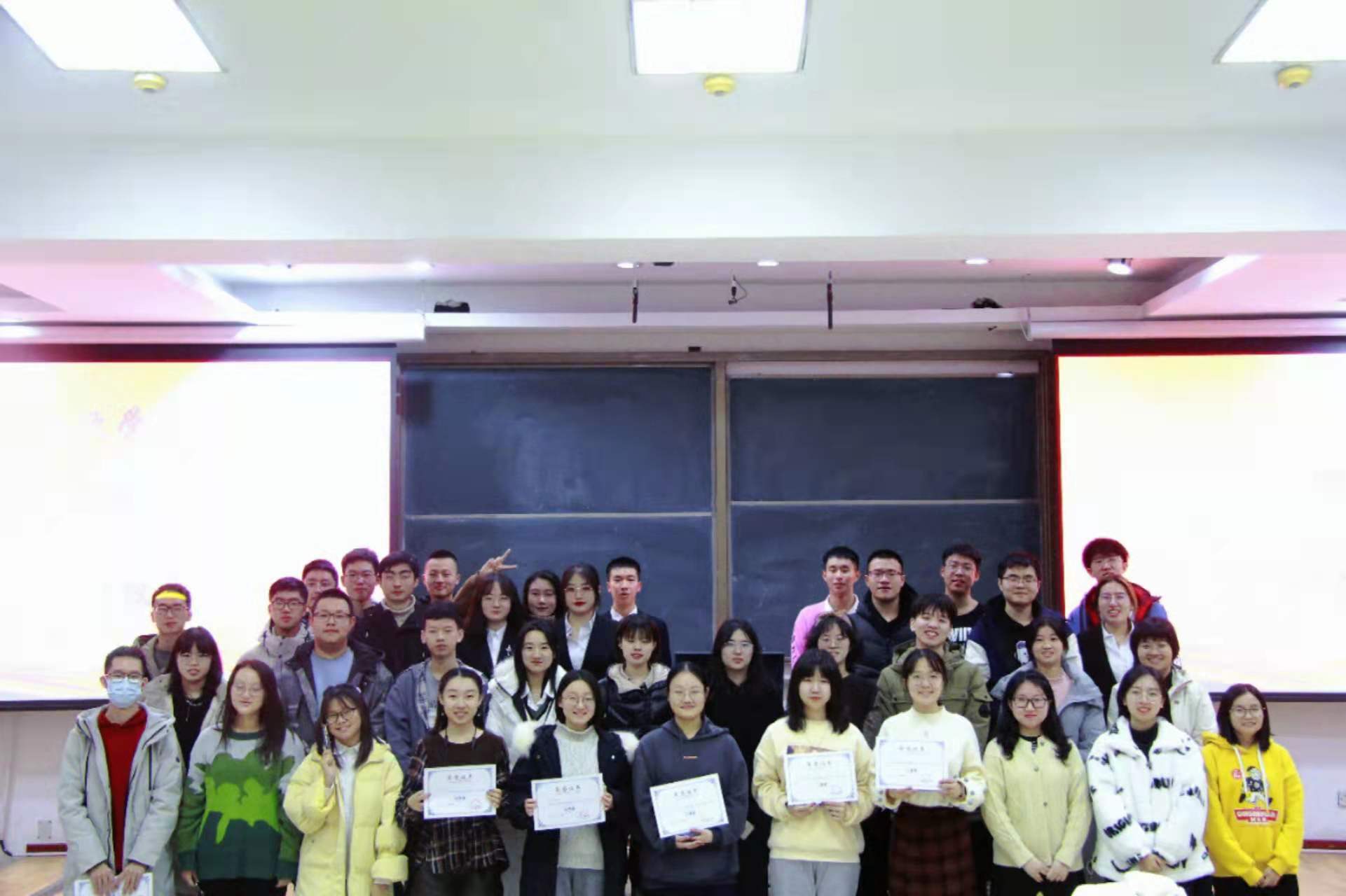 本次知识竞赛共分为初赛、复赛和决赛三个环节。经过初赛的筛选,有10名同学进入复赛,激烈的比拼之后共有6名参赛选手进入决赛,争夺冠军。整场比赛气氛十分热烈又不乏趣味性。经过三个环节的精彩比拼,最终,陈百川(2019级本科生)获得一等奖,赵仕杰(2020级本科生)和戴东亮(2021级本科生)获得二等奖,李怡凡(2021级本科生)、汪嘉慧(2021级本科生)和李垣欣(2021级本科生)获得三等奖,李梓琪(2021级本科生)和卫玉欣(2021级本科生)获得优秀奖。社团管理部主要负责人为获奖同学颁发奖状并合影留念,本次知识竞赛活动圆满结束。