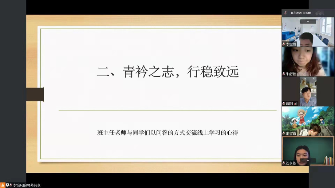 在2021级5班班会上,班主任李慧杰老师首先询问了同学们的居寝生活近况。接下来在北京居家隔离的满运璋表达了对能尽早返校的迫切和渴望。其后,赵梓含讲述了封寝期间的温馨日常,体现了同学们居寝期间的乐观心态。韩瑞也对同学们进行了积极的心理疏导,并分享了自己的日常趣事。最后,班主任赫泉玲老师表示:学校和学院对待疫情防控的态度是坚决的,采取的措施是积极的,同学们不必担忧和恐慌,应积极配合学校防疫工作,兼顾学习和身心健康,共克时艰、战胜疫情。