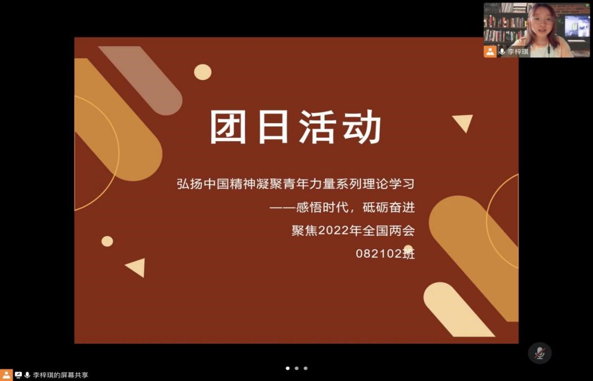 本次团日活动于线上展开,各团支部通过报告解读、视频观看、感悟分享三个环节全面、深入地学习政府工作报告。在报告解读环节,各班团支书就2021年工作回顾、2022年经济社会发展总体要求和政策取向以及2022年政府工作任务三个方面,带领同学们解读报告内容、领悟全会精神。在视频观看环节,同学们了解到近几年我国抗疫工作取得的成就,体悟到中国脱贫攻坚、全面建设小康社会的艰辛与不易,加深了对社会主义制度优势的理解。在感悟分享环节,杜艺轩(2020级本科生)表示,我们要更加紧密地团结在以习近平同志为核心的党中央周围,高举中国特色社会主义伟大旗帜,攻坚克难,砥砺奋进,以实际行动迎接党的二十大胜利召开。朱悦(2020级本科生)则联系当下疫情防控的现状,结合两会中总结的2021年疫情防控经验成果,呼吁同学们坚定信念,携手并肩,共克时艰。