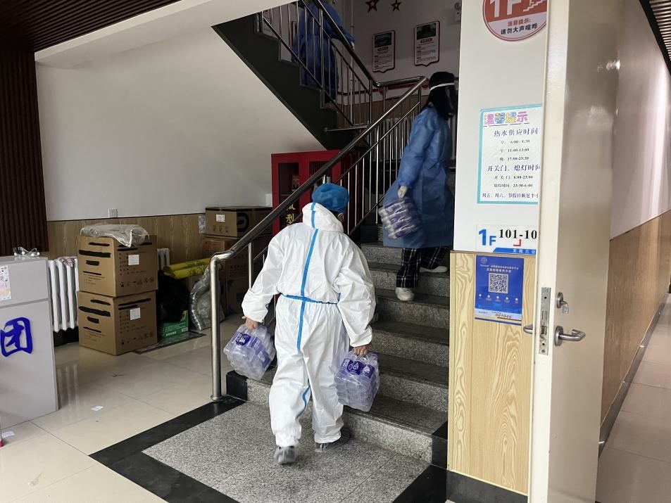 晨光尚未穿过黎明之时,她们已全副武装地下楼,轻轻地将丰盛的早餐放在寝室门口;她们披着月色回寝,厚重的防护服下,是被汗水浸湿地衣衫。李垣欣(2021级本科生)介绍道:“志愿工作大概分为两部分,一部分是负责分发餐饮食物与防疫物资的“配送员”;另一部分则是配合楼层长工作,搬运分发防疫物资,统筹管理与记录物资流动。”志愿者的工作往往伴随着辛劳与汗水,她们要将沉甸甸的物资搬向高层,穿戴着口罩与防护服工作加重着她们晕眩与疲惫感,但她们迎难而上、默契协作,完成了一项项志愿服务工作。“我们采用“流水线”的方式解决向高楼层搬运的难题!”盛佳宜(2021级本科生)这样描述她的志愿经历,“交接时默契配合、相互体谅,大家齐心协力最终让一切工作水到渠成。”