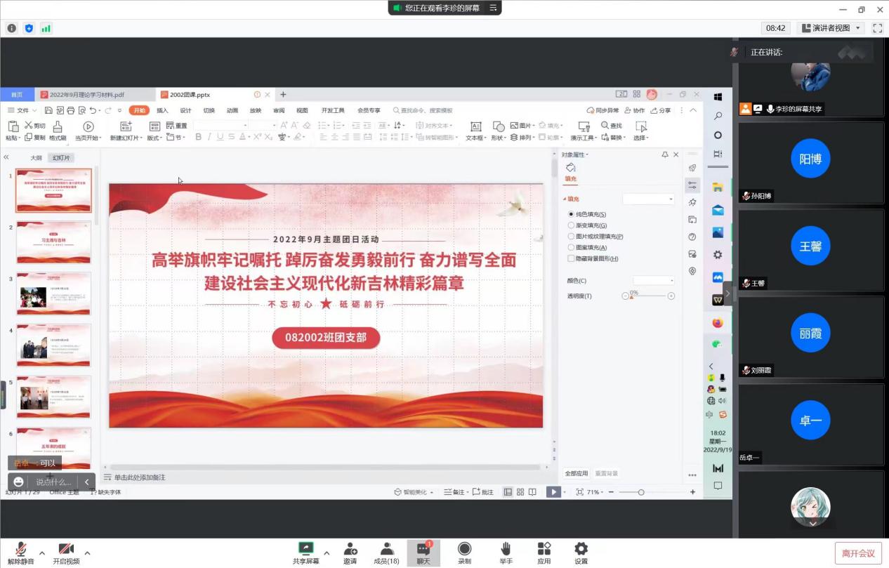 首先,各班团支书播放视频《喜迎党代会 建功新时代——吉林振兴这五年》,使同学们更加深刻认识到了吉林省五年来的发展与成就,更加明确了作为一名大学生的政治使命和责任,更加坚定了为共产主义奋斗的决心。在交流分享环节,同学们自由交流,分享了自己的心得体会,杜艺轩(2020级本科生)指出,我辈青年应高举中国特色社会主义伟大旗帜,忠实践行习近平总书记视察吉林的重要讲话和重要指示精神,走好新的赶考路,奋力谱写全面建设社会主义现代化新吉林精彩篇章。在本次团日活动的最后,同学们就本次学习内容进行了交流,踊跃分享了自己对于学习景俊海在中国共产党吉林省第十二次代表大会上的报告的心得体会,并各自表述了对吉林省未来发展的展望与期待,展现了同学们扎根本土、心系社会的家国情怀。