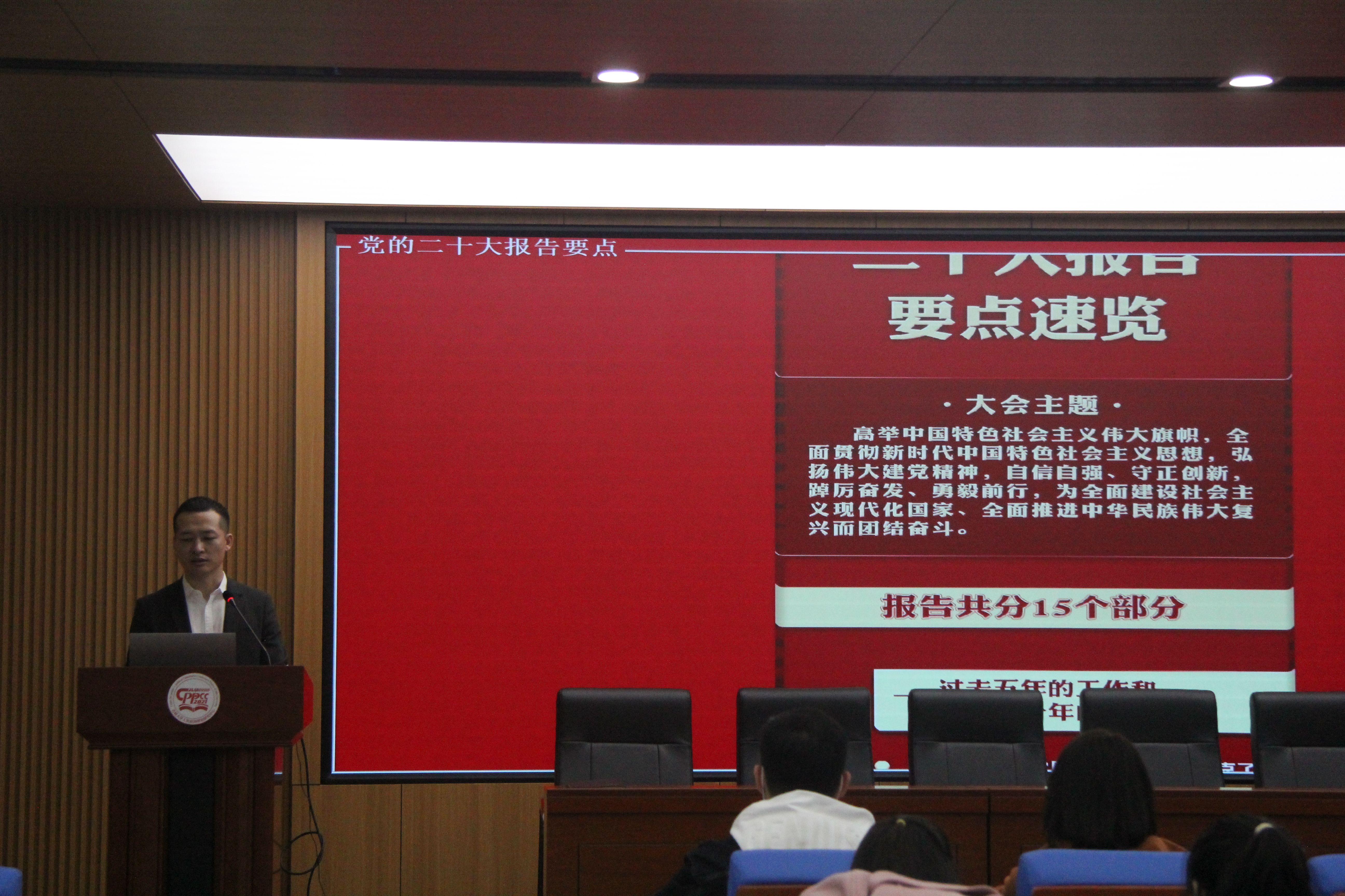 张洁在会上主讲党课,带领全体本科生党员、发展对象共同学习党的二十大精神。张洁介绍了习近平总书记同其他51位党和国家党员领导同志作为党中央提名的代表候选人全部当选党的二十大代表情况,分析了二十大代表结构比例,展示了中央政治局等新一届中央领导机构组成情况,细数党的二十大报告从起草、讨论重大理论和实际问题、听取意见建议、确定框架结构到修改、定稿的诞生过程,逐条回顾了党的二十大报告要点和新提法,着重对比了党的十七大以来大会工作报告关于教育和人才工作的论述。张洁指出,历届党代会报告与时俱进,但科教兴国、人才强国战略始终未变,坚持党管人才、汇聚各方面优秀人才、办人民满意的教育的方针始终没变,尊重劳动、尊重知识、尊重人才、尊重创造,落实立德树人根本任务,培养德智体美劳全面发展的社会主义建设者和接班人的任务没有改变。这就要求我们不断强化现代化建设人才支撑,坚持教育优先发展、科技自立自强、人才引领驱动,加快实施创新驱动发展战略,从百年未有之大变局与意识形态领域形势发生的全局性、根本性转变出发,持续用党的创新理论增强武装、教育师生、指导实践,发展全过程人民民主、全面发展协商民主、积极发展基层民主,坚持党的领导、人民当家作主、依法治国有机统一,推进具有中国气派、吉大特色、行政风格的政治学和管理学学科体系、学术体系、话语体系建设,为学院各项事业建设发展创造良好环境。张洁结合《中共中央关于认真学习宣传贯彻党的二十大精神的决定》精神,就党支部进一步学习宣传贯彻党的二十大精神做了工作部署,并现场组织与会党员关注“廉洁吉林”微信公众号,参与“学习贯彻二十大 纪法教育进行时”2022年度全面从严治党知识答题活动。