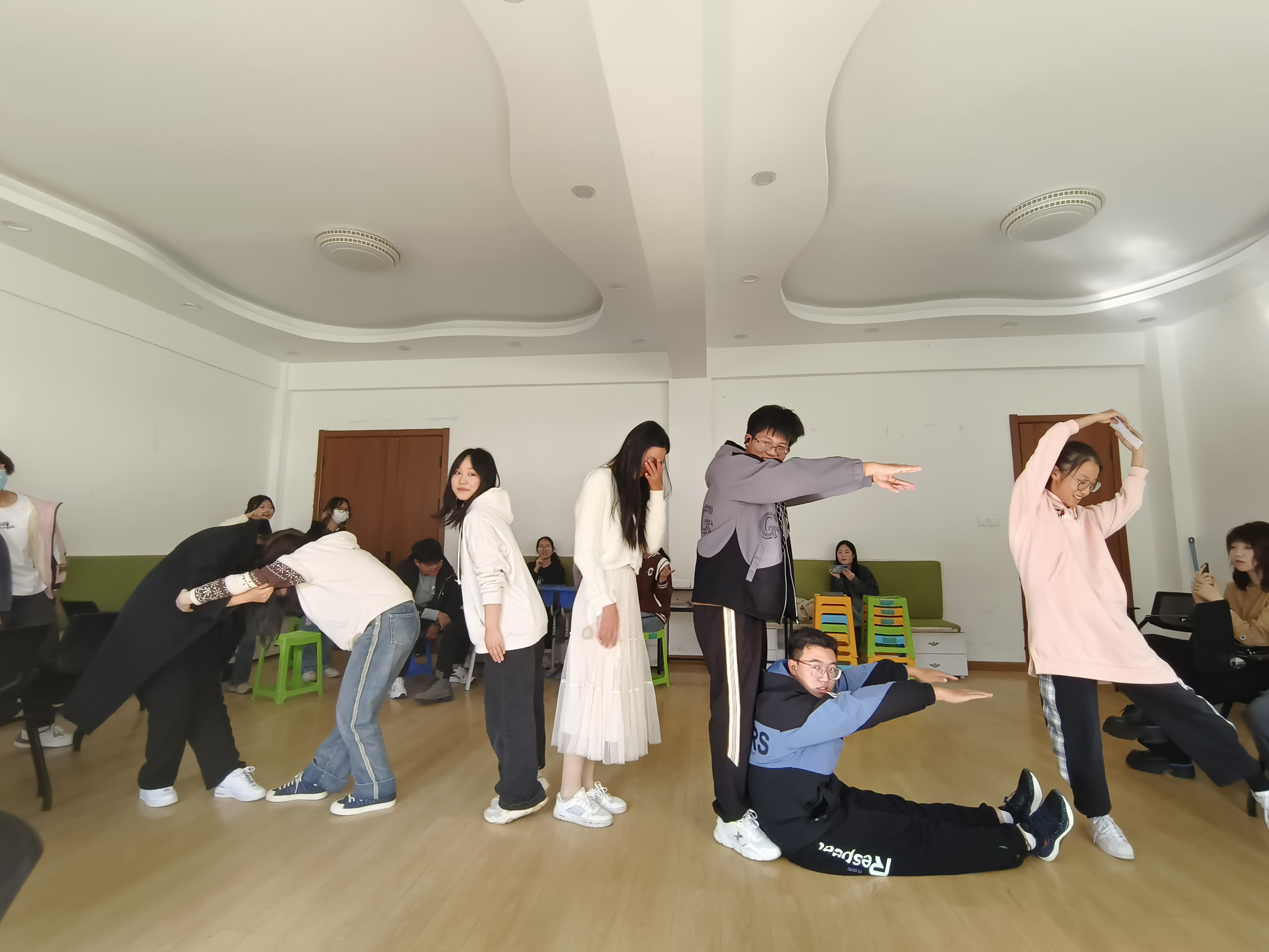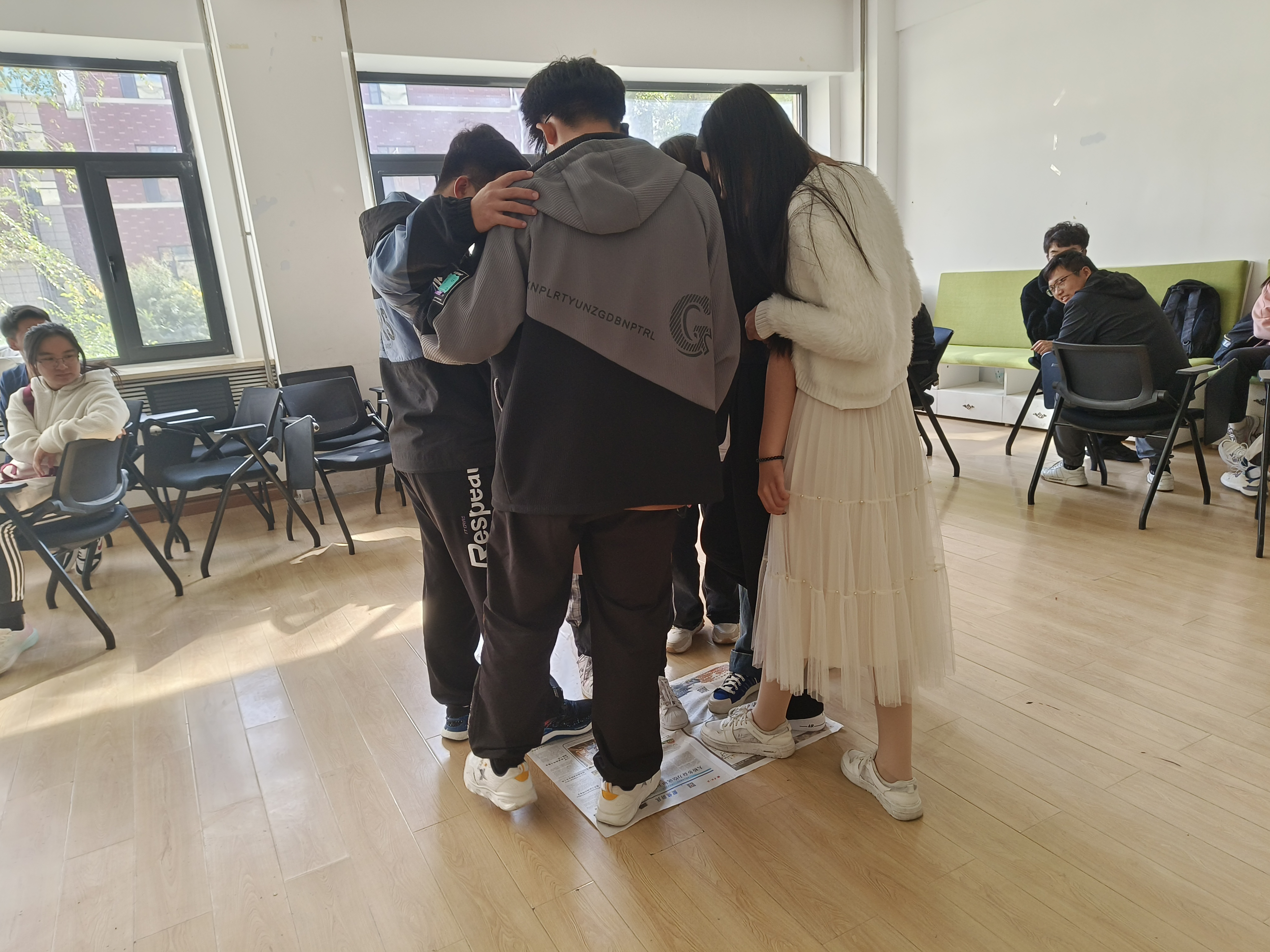 本次主题班会系列活动主要分为以下几个阶段:首先是热身阶段,在一分钟鼓掌中,同学们用热烈的掌声迎接大学生活。其次是“我知道”环节,在小组内同学们互相进行自我介绍,然后再随机抽取同学,其他同学大声说出对他(她)的了解。然后是“集体登陆”环节,主要考验同学们的集体合作能力,小组成员需要相互配合,共同站在一张报纸上方为成功。随后的“人体字母”游戏受到了同学们的热烈欢迎,大家共同谋划,互相协作,用身体搭建起“HAPPY”、“HOME”等单词,感受到集体合作的快乐。在活动最后,每个小组绘制心中的团体树,并集体合影留念。心理团辅活动在欢声笑语中走向结束。