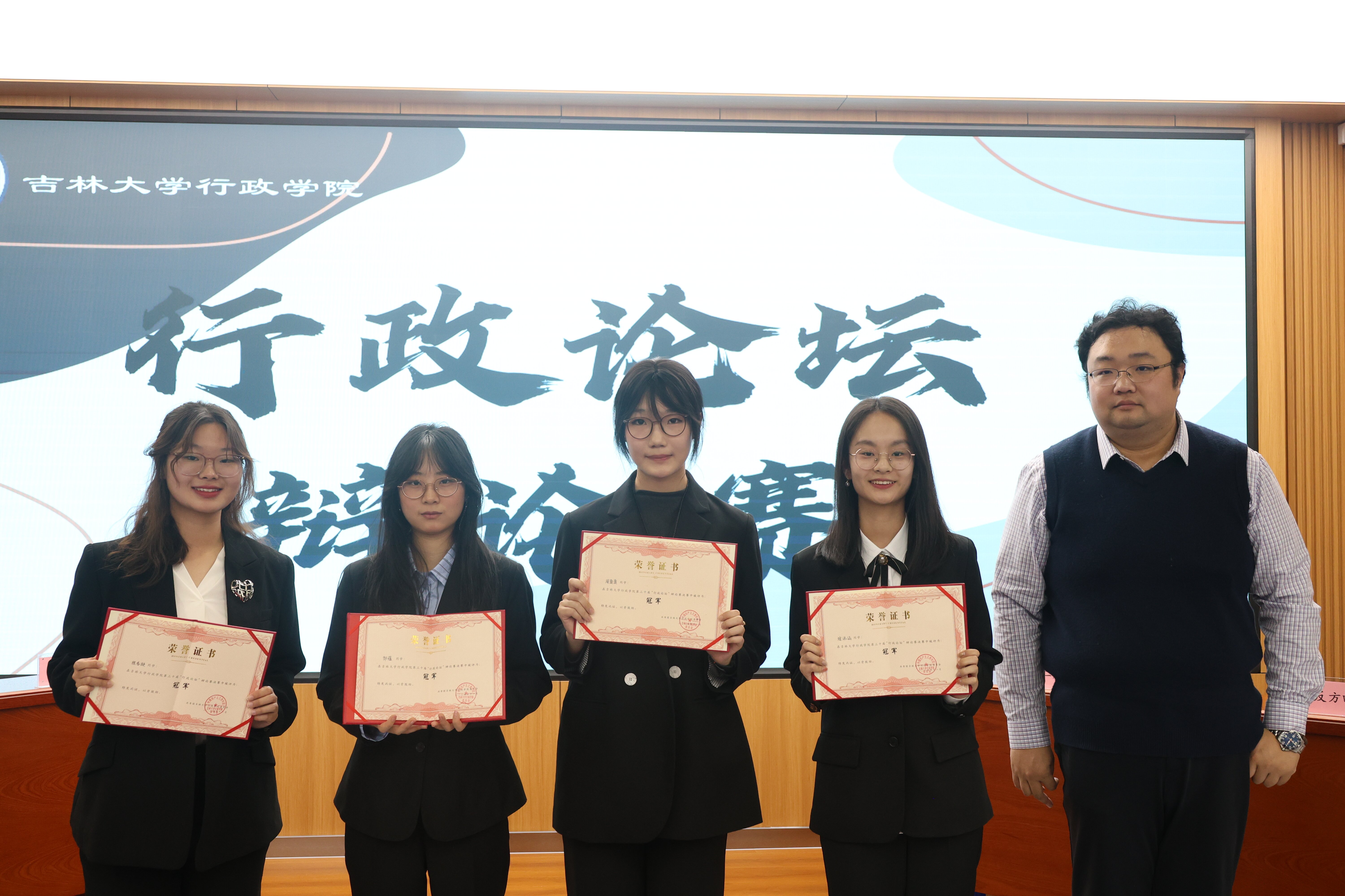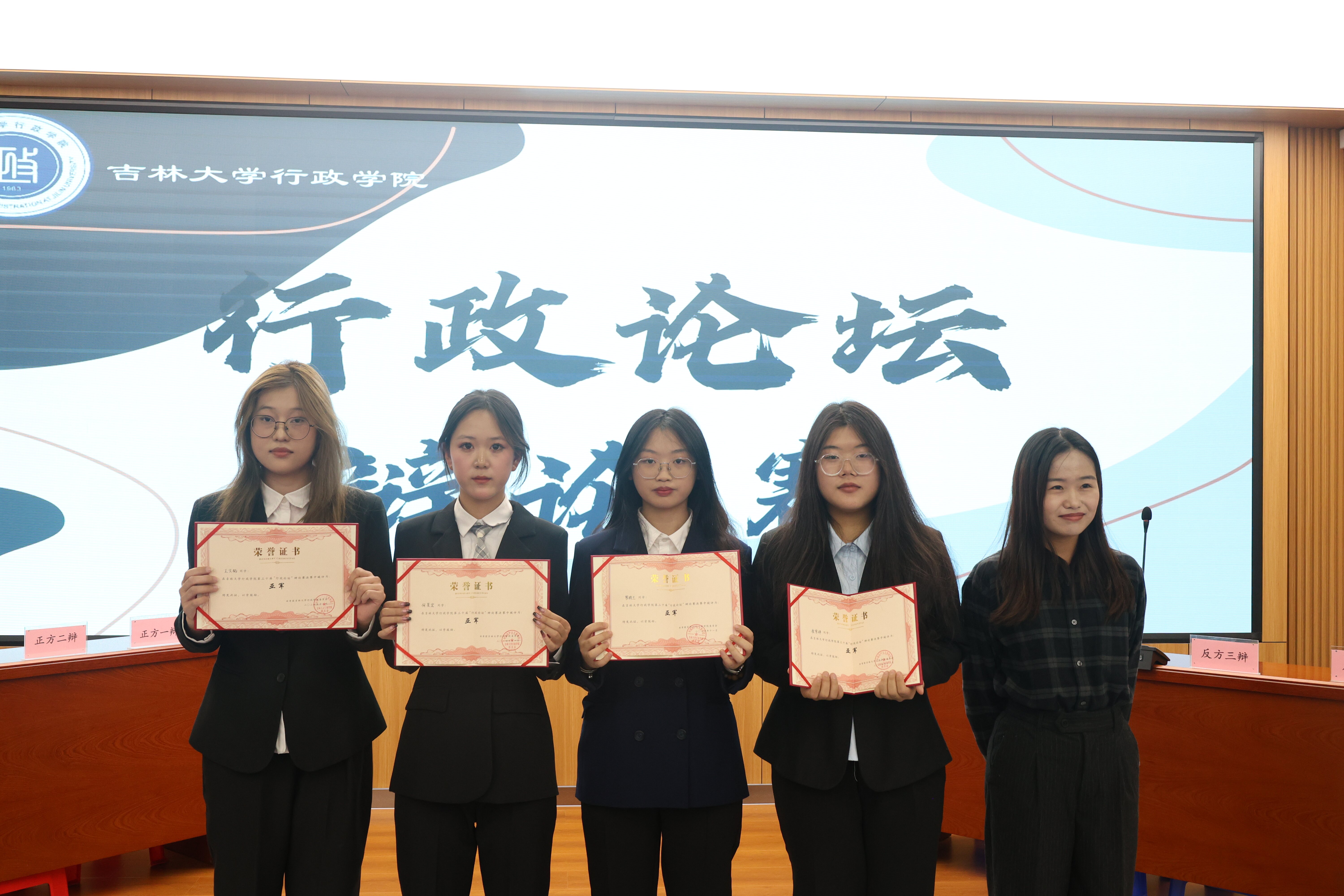 经过激烈的辩论角逐,反方队伍(2024级本科生程香凝、寇添涵、周盈盈、邹蕴)获得了本次“行政论坛”辩论赛的冠军,正方队伍(2024级本科生王文韬、何星宏、罗梓兰、崔雪婷)将亚军收入囊中,正方三辩罗梓兰(2024级本科生)同学斩获“最佳辩手”称号。评委老师为获奖队伍和最佳辩手颁奖并合影留念。