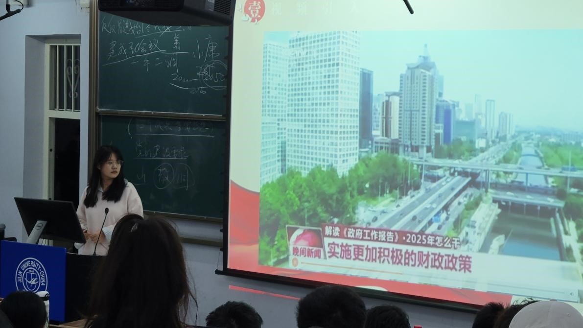 学习解读环节,黄滢皓同学(2023级本科生)和裴嘉琳同学(2023级本科生)带领同学们阅读《政府工作报告——2025 年 3 月 5 日在第十四届全国人民代表大会第三次会议上》,接着对文章摘录进行重点概括与提炼,进而表明作为新时代青年,应当坚定不移高举中国特色社会主义伟大旗帜,为实现中华民族伟大复兴的中国梦努力奋斗。