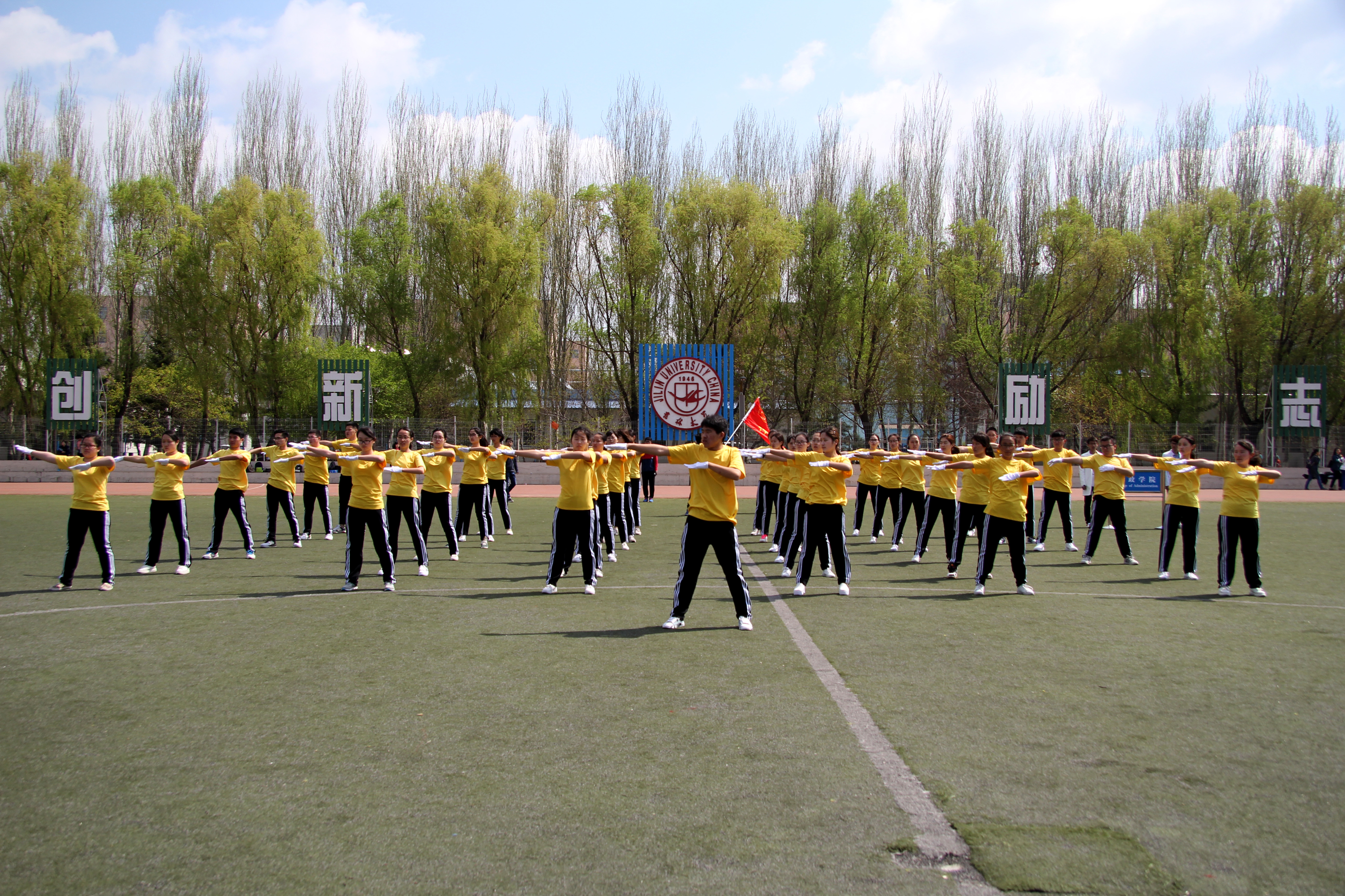 全体参赛队员统一身着黄色衬衫,喊着嘹亮的口号,迈着整齐的步伐入场。比赛场上,全体同学扬起自信的微笑,伴着激昂的音乐和响亮的节奏声作出规范统一的动作,赢得了前来观赛的老师和同学们的赞扬,充分展现了学院学生积极向上的精神风貌。学院比赛结束后,全体参赛队员在体育场进行了合影留念,为连日来的训练画上了一个完满的句点。
